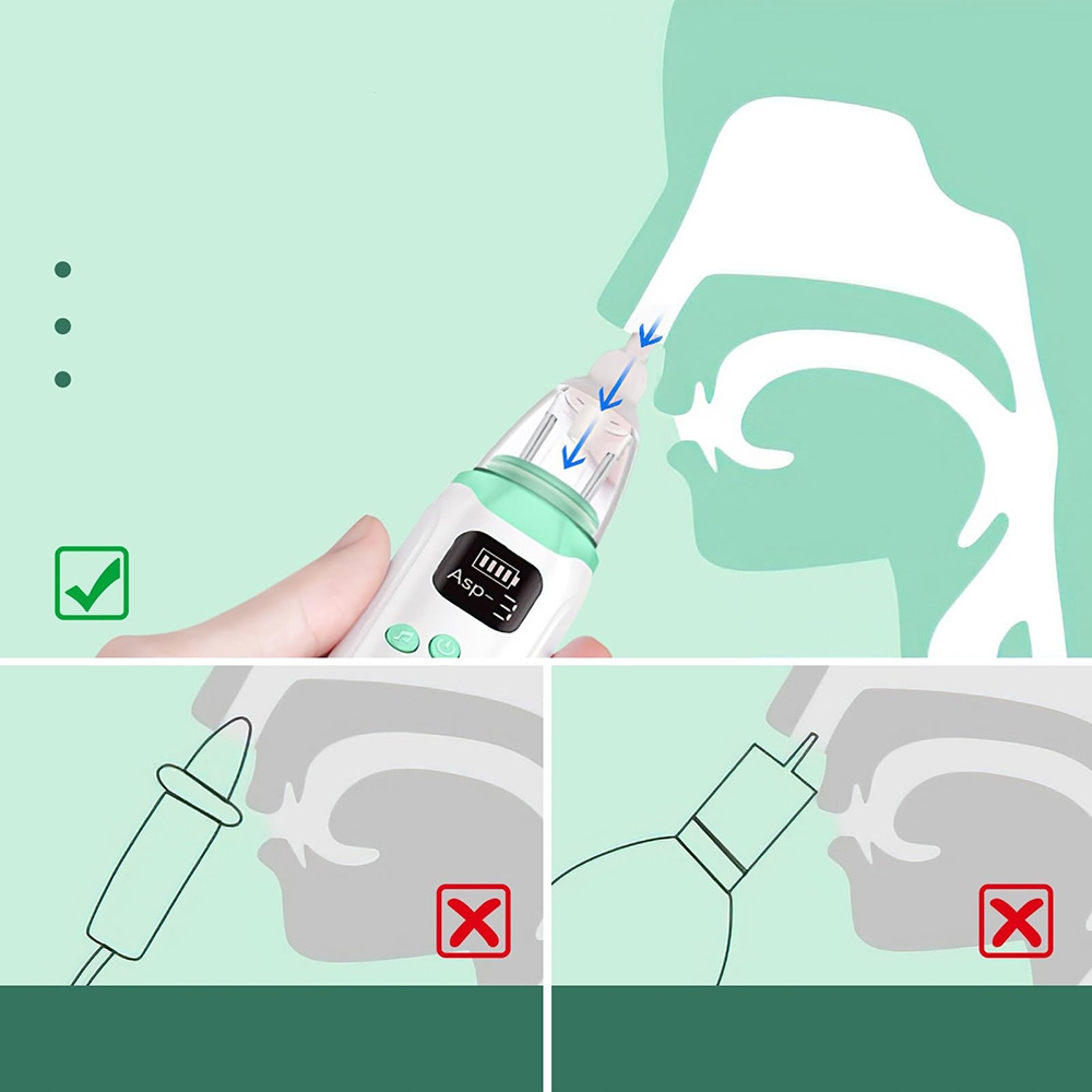 1. 【Сильна сила всмоктування】 Цей аспіратор немовлят для немовлят характеризується високою силою всмоктування до 65 кПа. Три рівні всмоктування можна регулювати, щоб видалити майже кожен тип нежить. (ПРИМІТКА: Спочатку пом'якшуйте стійкий нежить і слиз за допомогою носової розпилювальної солі. Залиште 30 секунд до 1 хвилини до використання аспіратора. Три різні розміри наконечників для багаторазового використання для носа підходять для дітей різного віку та з різною висотою.