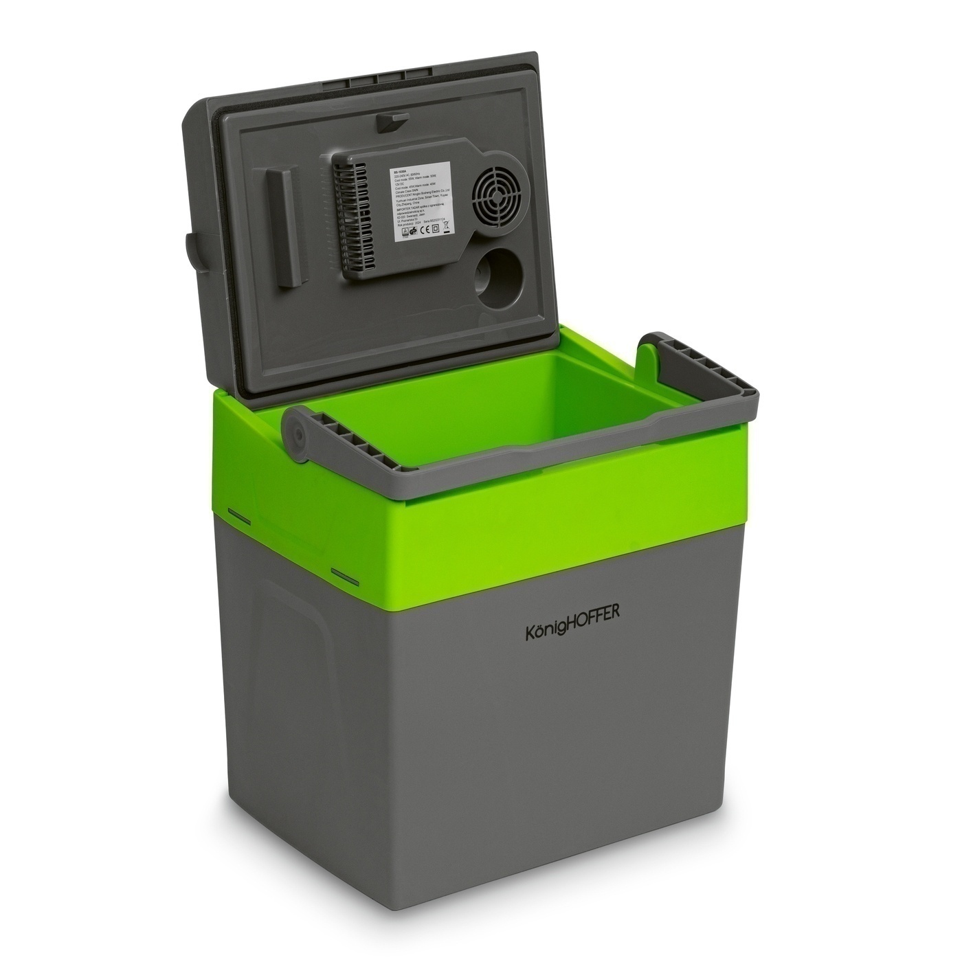 Туристичний електричний холодильник Konighoffer Frozen має об'єм 30 літрів, він термоізольований пінополіуретаном, а його корпус виготовлений з міцного пластику. З його допомогою ви збережете продукти свіжими протягом багатьох годин під час подорожі. Подібним чином ви можете подбати про напої, які берете з собою. Більше того, ви отримаєте туристичний холодильник, який добре охолоджує та нагріває вміст. Просто використовуйте зрозумілу панель керування на задній панелі продукту. Там же ви знайдете гнізда для кабелів, що входять до комплекту, і за потреби можете встановити режим роботи ECO. Ви також отримаєте зручність перенесення моделі під час подорожі та стабільне її розміщення. Велика ергономічна ручка виконує ще одну функцію. Правильно розташувавши його, ви захистите холодильник 12 В 230 В від відкриття кришки під час транспортування або закриття. Ви також можете підключити живлення кулера до електричної розетки або автомобільного прикурювача. Рівень шуму при роботі портативного холодильника Frozen не перевищує 26 дБ.