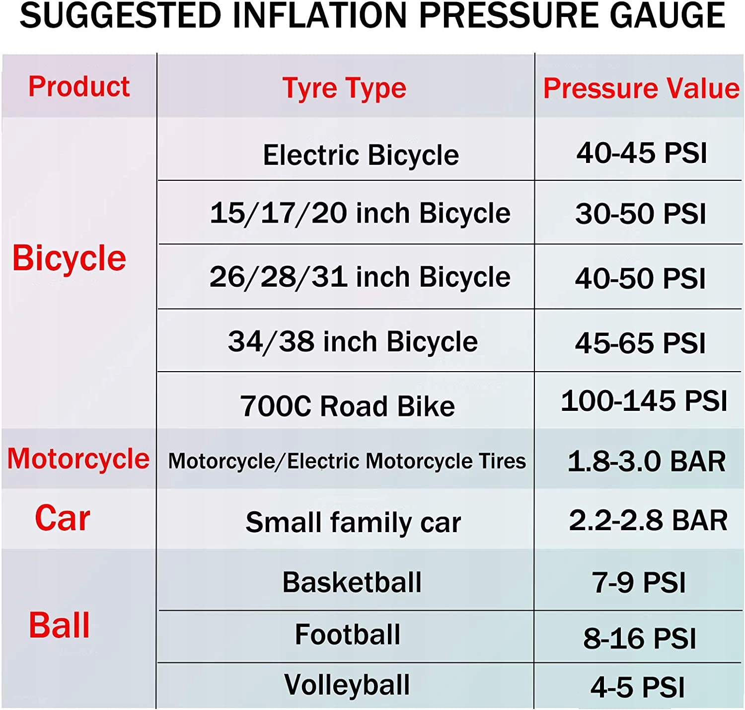 Дизайн 3 в 1. Новий велосипедний насос 2021 — це дизайн 3 в 1, який складається з насоса-ліхтарика та зарядного пристрою. Продуманий дизайн – лише для того, щоб запропонувати вам максимально функціональні вироби. Тиск у шинах Перш ніж накачати шину, ви можете встановити відповідний тиск у шині. Після заповнення він автоматично вимикається. Це дозволяє уникнути ризику вибуху через надмірне надування. Натяг повітря пружини становить 3050 фунтів на квадратний дюйм для 151720, 4050 фунтів на квадратний дюйм для 262831 і 4565 фунтів на квадратний дюйм для 8438. Дорожні шини 700c мають 100145 фунтів на квадратний дюйм. Мотоцикли 18 30 бар. Машина має 2228 бар. Пік становить 714 psi. Електричний повітряний насос має 4 одиниці вимірювання PSI KPA кг см2. Багатофункціональний повітряний насос. Повітряний насос оснащений світлодіодною системою нічного перегляду та цифровим РК-дисплеєм. Коли ліхтарик увімкнено, він стає синім і червоним і може використовуватися як аварійне освітлення вночі. Сфера застосування Насос підходить для всіх типів велосипедів, наприклад, гірських велосипедів, гоночних велосипедів та електричних велосипедів.Також підходить для мотоциклів, шин для інвалідних візків, автомобілів, велосипедів або плавальних кілець. Однак їх не можна використовувати для вантажних шин, фургонів і кемперів.