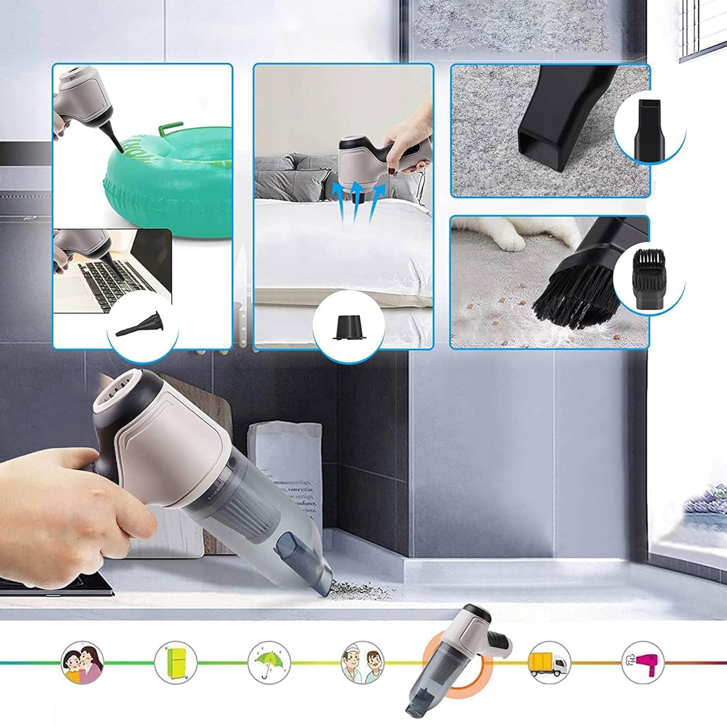 Цей автомобільний пилосос постачається з 6 різними насадками, які краще відповідають вашим потребам у прибиранні, забезпечуючи ретельне прибирання за допомогою стисненого вакуумного мішка/надувного кільця для плавання/повітродувки та пилососа 6 в 1.