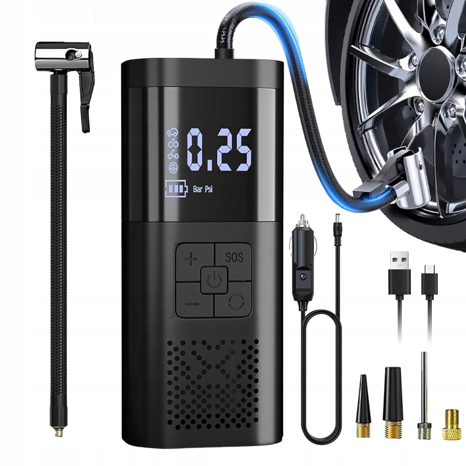 Багатофункціональний повітряний насос: повітряний компресор поставляється з 4 адаптерами для накачування автомобільних/мотоциклетних/велосипедних шин, плавальних кілець, байдарок, футбольних м’ячів, баскетбольних м’ячів, дитячих басейнів, спальних мішків, наметів і багато іншого. Акумуляторний компресор невеликий, легкий і ергономічний, підходить як екстрене обладнання для виходу на вулицю, подорожей, їзди на велосипеді, кемпінгу тощо.