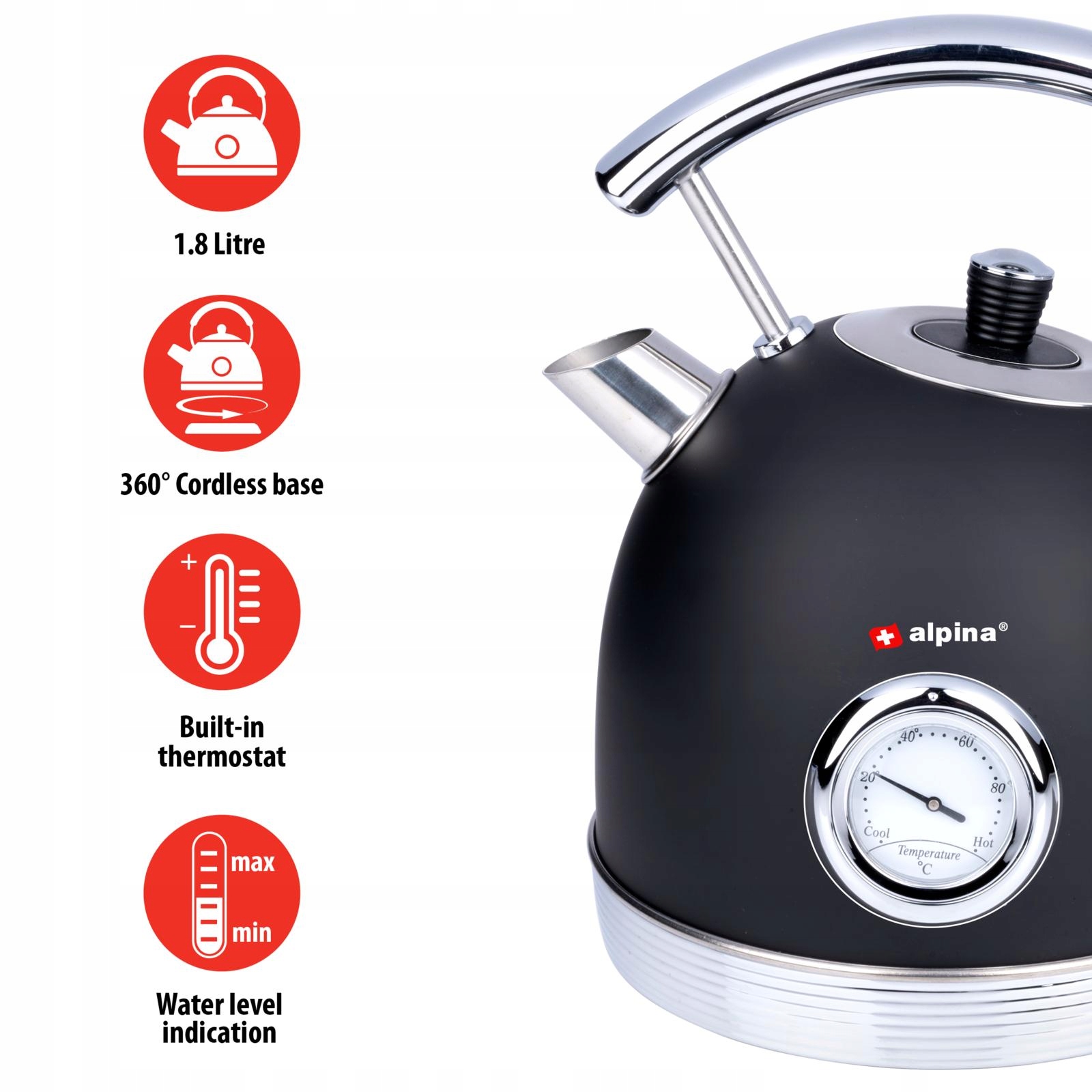 Ви шукаєте ретро-чайник, який миттєво нагріє воду до ідеальної температури? Тоді цей чорний чайник Alpina в стилі ретро саме для вас. Чайник має об'єм 1,8 л, має вбудований термостат, прозорий індикатор рівня води, захист від кипіння та сталеву ручку, яка робить наливання води легким та безпечним.