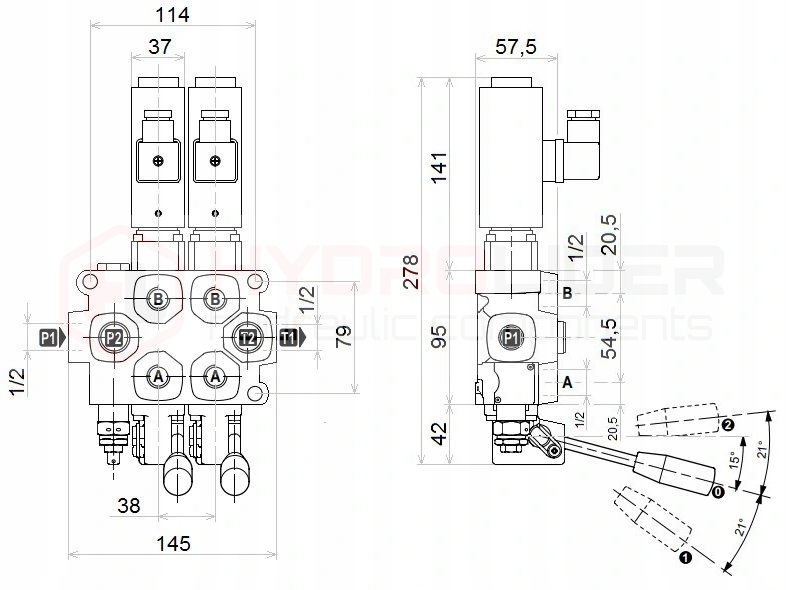 - Пошук живлення від насоса (P1, P2): внутрішня нитка BSP 1/2 ''