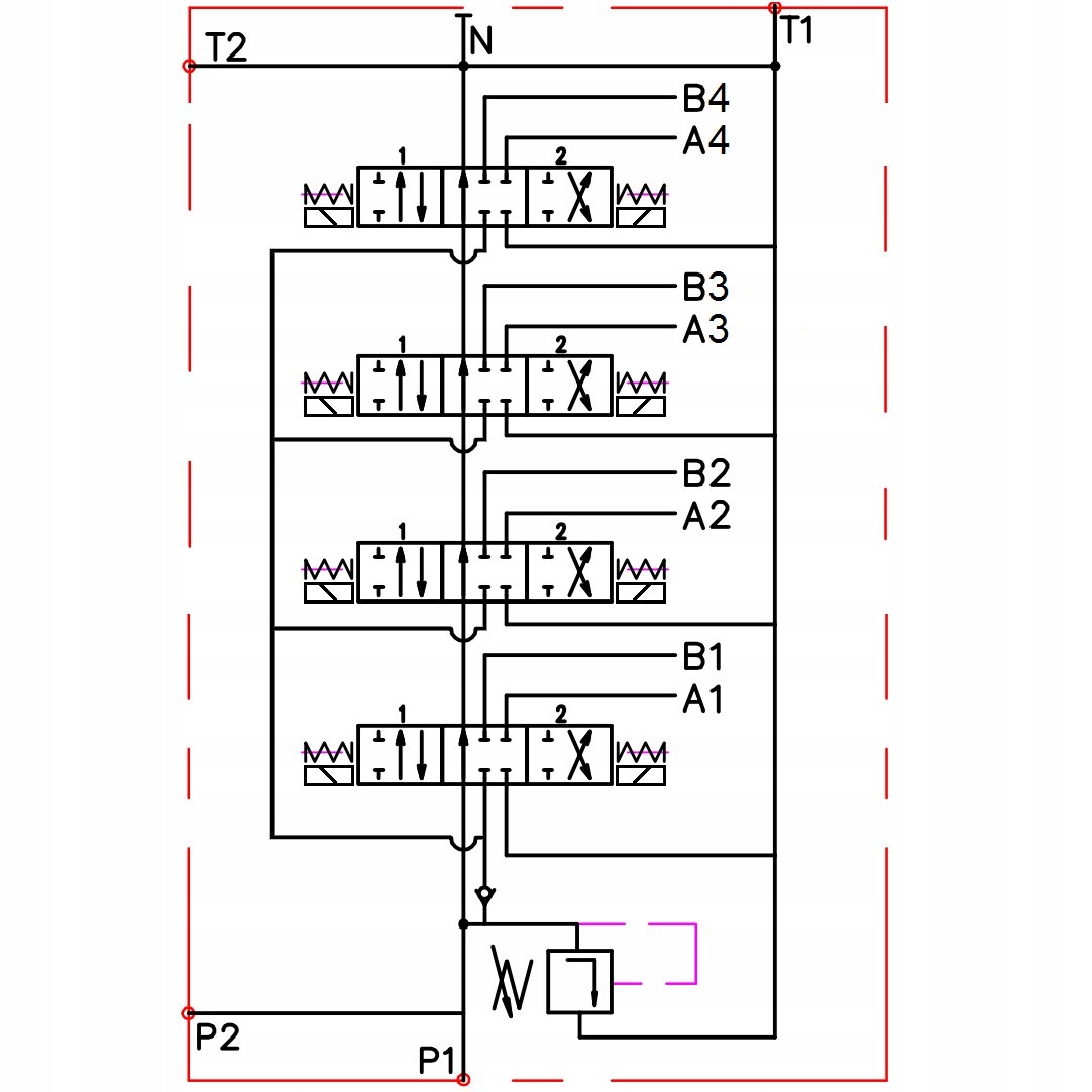 Всі повзунки трипозиційні (1 - 0 - 2), підпружинені, тобто повертаються в нейтральне положення самостійно після відключення живлення. Коли повзунок знаходиться в нейтральному положенні (0), масло вільно тече через розподільник у зворотний канал, тоді насос не працює під тиском і розвантажується.