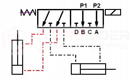 Електромагнітний клапан за допомогою електричного імпульсу (24 В) дозволяє перемикати керування між двома незалежно працюючими приводами подвійної дії. Це ідеальне рішення, коли у нас є гідравлічний розподільник, у якому вже використовуються всі наявні секції, і раптом виникає потреба керувати новим додатковим приводом.