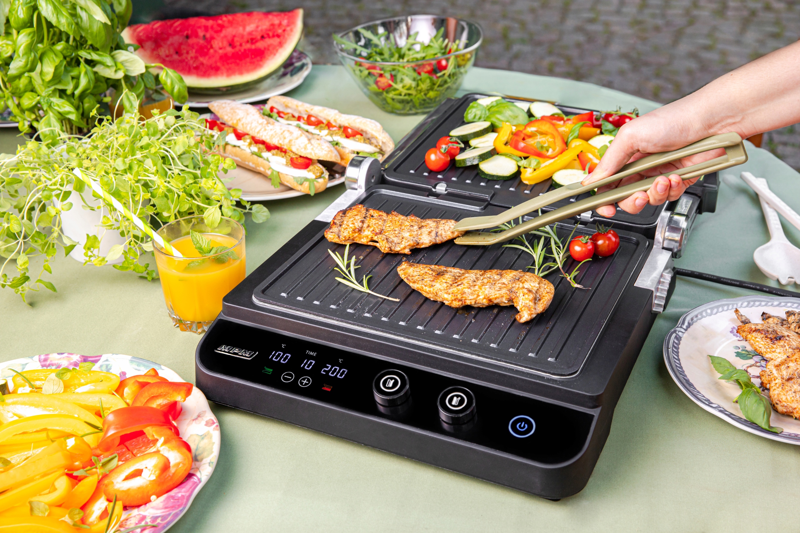 Електрогриль MGR-11M дуже простий у використанні та надійно виготовлений. Корпус з нержавіючої сталі надає йому стильного вигляду. Панель управління з світлодіодним дисплеєм дозволяє легко змінювати найважливіші налаштування. Завдяки цьому ви можете легко встановити відповідну незалежну температуру для кожної конфорки, вмикати/вимикати обладнання та налаштовувати функцію ТАЙМЕР - в діапазоні від 1 до 99 хвилин.
