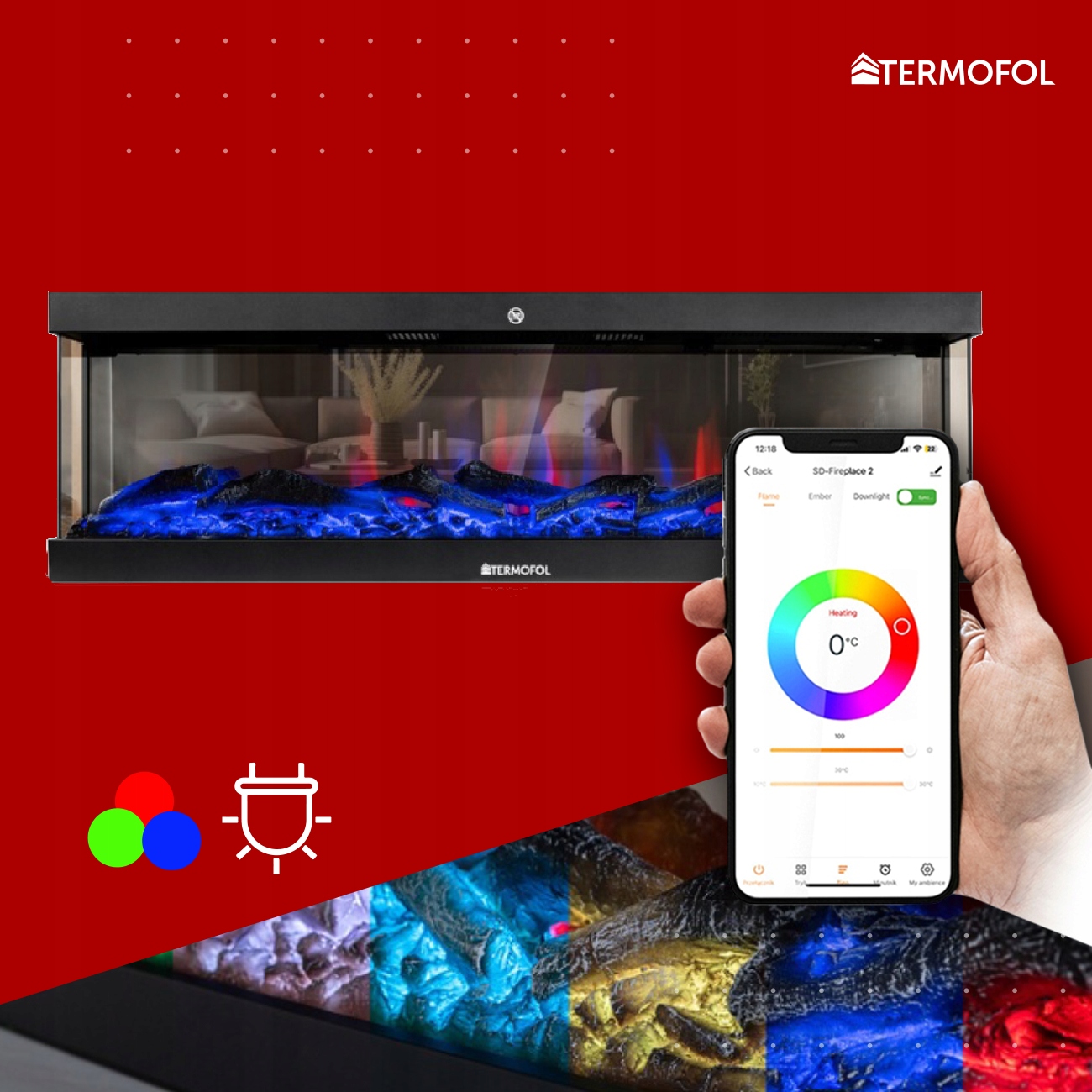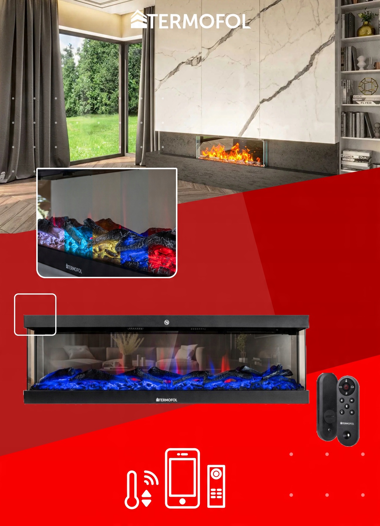 >✨ Каміни серії TF-EF-1324 дозволяють налаштувати колір підсвічування вугілля, колір полум'я, а також яскравість і швидкість ефекту полум'я. Усе це за допомогою пульта дистанційного керування, програми або панеліна корпусі, що входить у комплект.