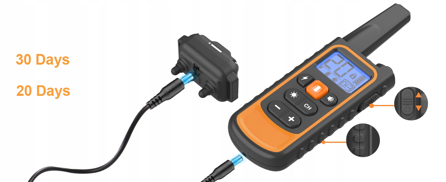 Електричні коміри для собак можуть бути повністю заряджені протягом 2 годин. Приймач може працювати до 35 днів у режимі очікування, а пульт дистанційного керування 90 днів! Крім того, електричний комір, активований з гавканням, містить освітлювальну функцію, яка допомагає запобігти загубленню собаки вночі та висвітлює шлях додому.