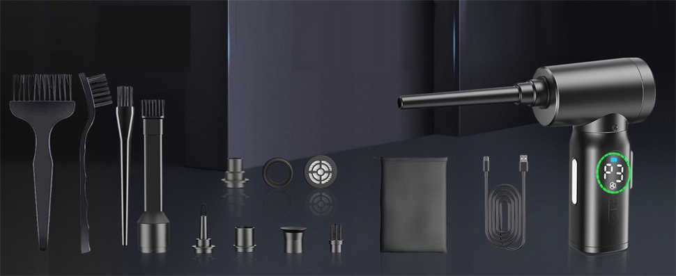 багате обладнання та багато застосувань. Передній дме пил, а задня смокче. Різні поради та пензлі відповідають різним потребам, пов’язаним з очищенням клавіатур, лінзам камер, верстатами для вікон та накачуванням пневматичних матраців, подушками безпеки та плаваючими колесами