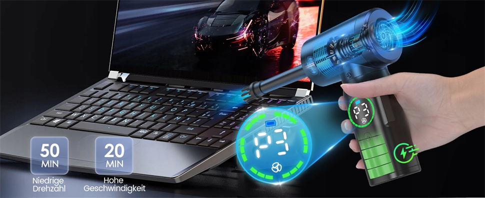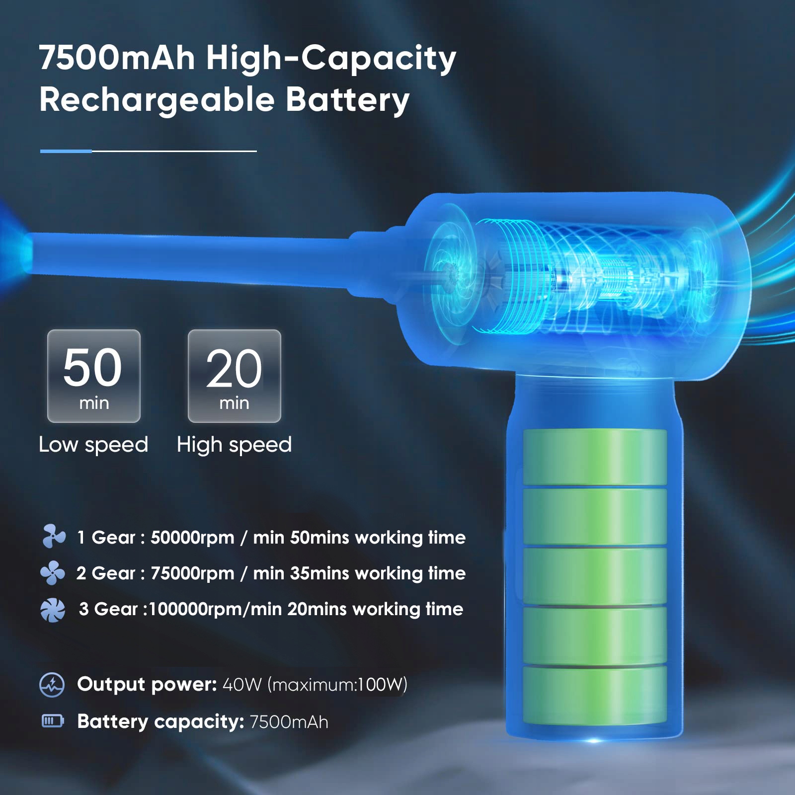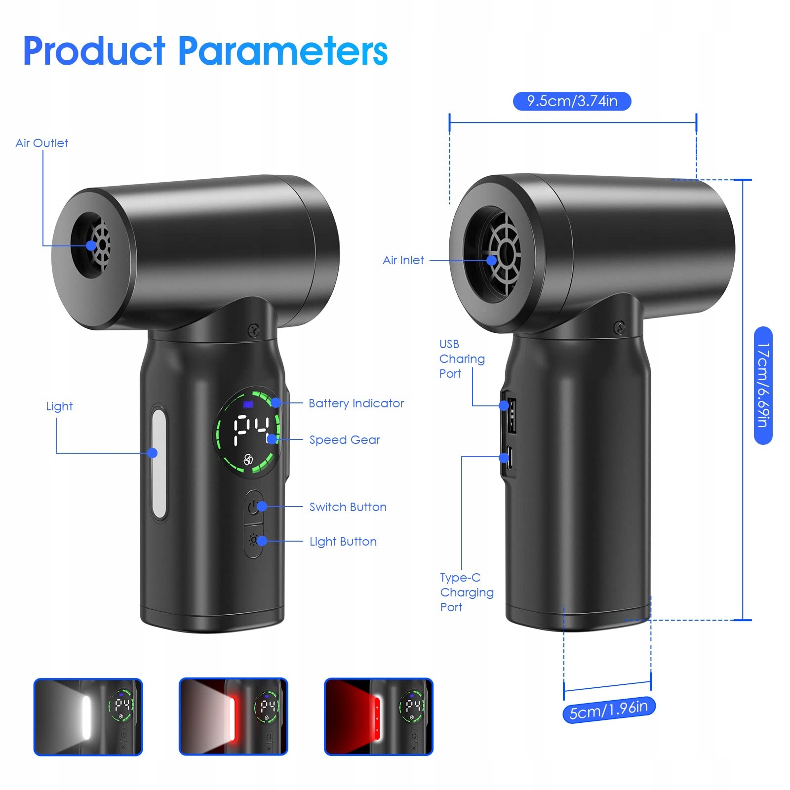 Безчесний двигун та 3-ступінчастий режим вентилятора, оснащений новим безщірним двигуном 150 Вт, що забезпечує останню силу ефективності та видування 1,86–2,51 унції. Електричний пиловий повітродувка може очистити різні предмети завдяки 3 рівням швидкості 100 000 об / хв. (Макс.) --- Натиснення перемикача протягом 3 секунд протягом тривалого часу призводить до включення або вимкнення пристрою. Коротке натискання комутатора дозволяє перемикатися між чотирма швидкостями вітру