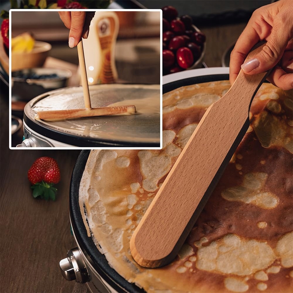 Для пристрою дерев'яна скалка для намазування. У комплект входить тісто і лопатка для перевертання млинців, завдяки чому ви зможете приготувати ідеальні, рівні млинці, як у професійній млинниці.