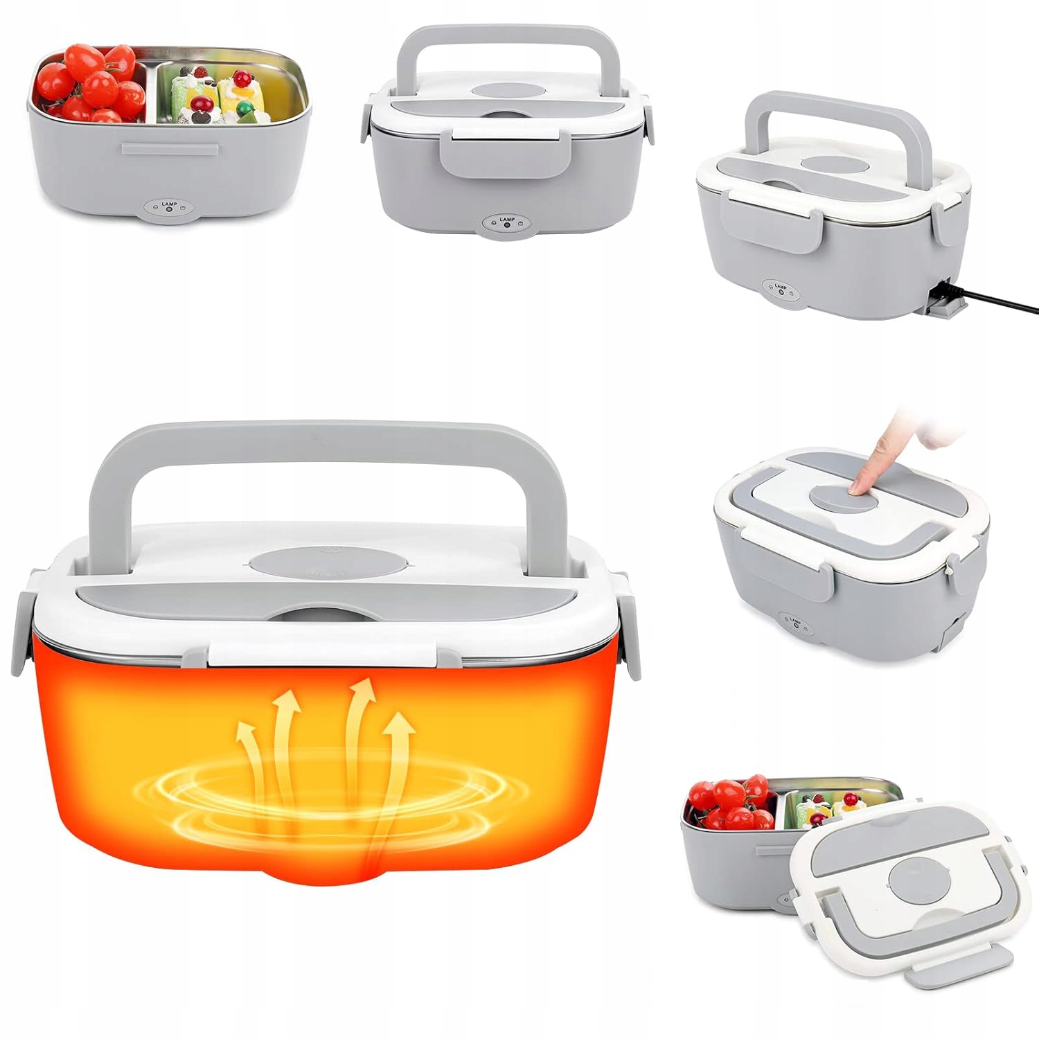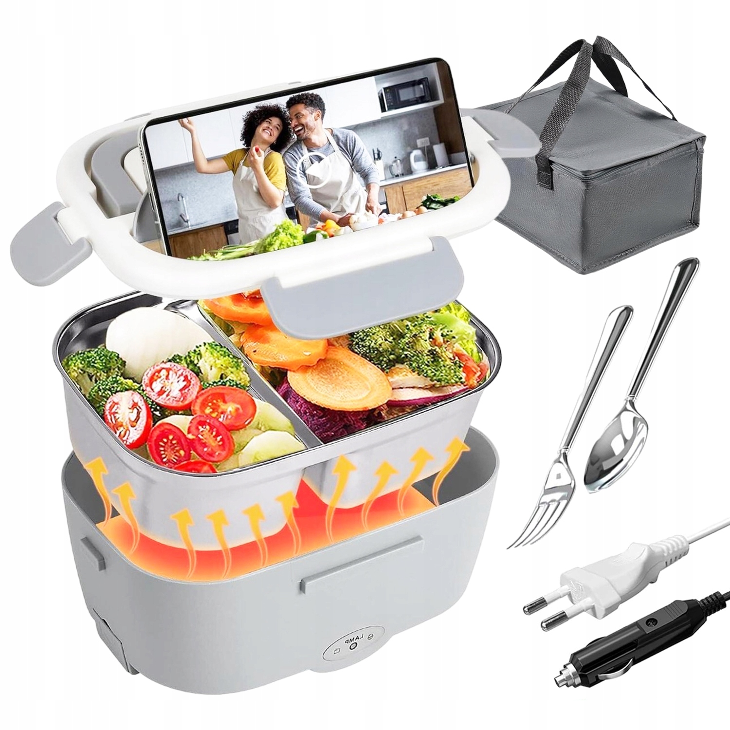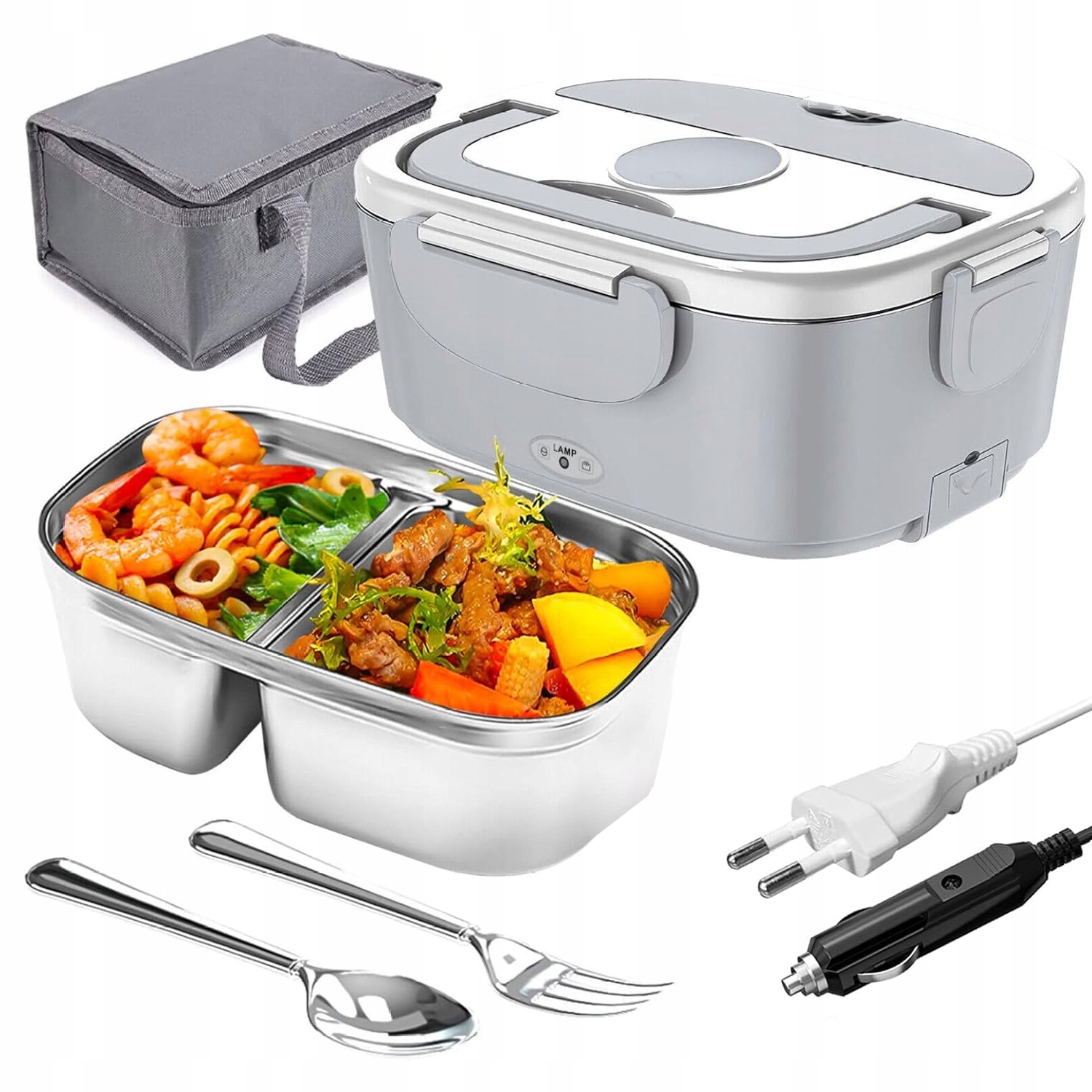 ⭐️ЕЛЕКТРИЧНИЙ ЛАНЧБОКС 220 В/110 В 12 В/24 В ПРОТЕКТИ ЗІ ЗНІМНИМ КОНТЕКРОМ З НЕРЖАВІЮЧОЇ СТАЛІ 304 1,5 Л + штекер прикурювача + ложка + виделка + сіро-чорна ізольована сумка⭐️