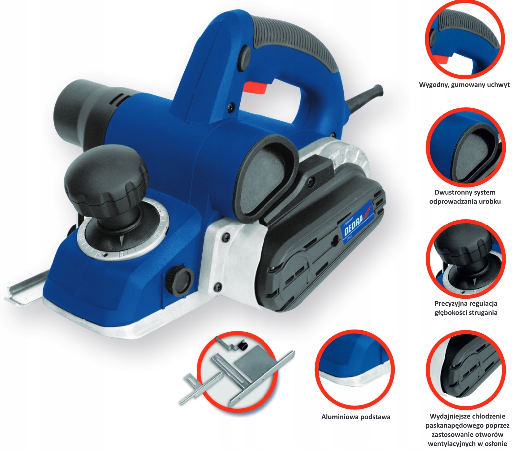 Спеціалізований електрорубанок DEDRA потужністю 1050 Вт призначений для обробки деревини. Прилад характеризується сучасним дизайном і ергономічною формою. Алюмінієва ніжка пристрою не деформується. Пристрій дозволяє виконувати стругання шириною 82 мм і глибиною до 3 мм. Під час роботи двигун пристрою може генерувати до 16 000 обертів головки в хвилину. Завдяки протиковзким накладкам на головній ручці літак надійно лежить у руці. Пристрій має функцію автоматичного висування «паркувальної ніжки». Стружка ніколи не накопичується під алюмінієвою ніжкою, тому що вона автоматично викидається вправо або вліво. У комплект рубанка входять: мішок для пилу.