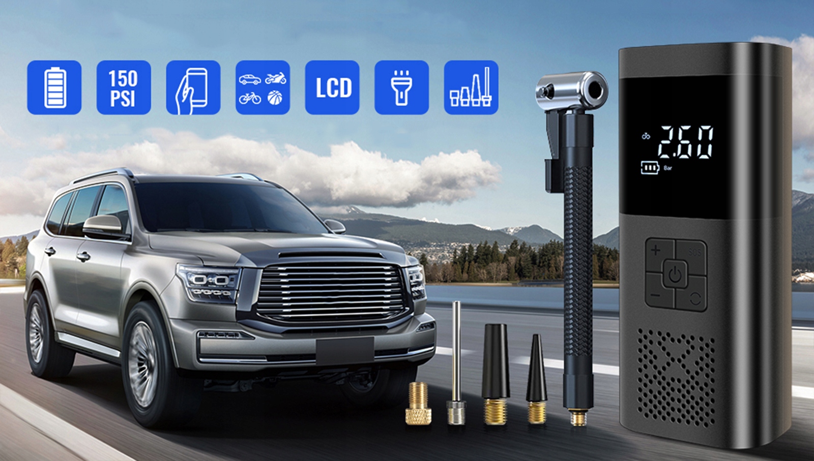 - Цей бездротовий повітряний компресор постачається з 4 додатковими адаптерами для накачування автомобільних/мотоциклетних/велосипедних шин, плавальних кілець, байдарок, футбольних м’ячів, баскетбольних м’ячів, дитячих басейнів, спальних мішків. , намети та інше. Акумуляторний компресор невеликий, легкий і ергономічний, підходить як аварійне обладнання під час виходу, подорожі, їзди на велосипеді, кемпінгу тощо.
