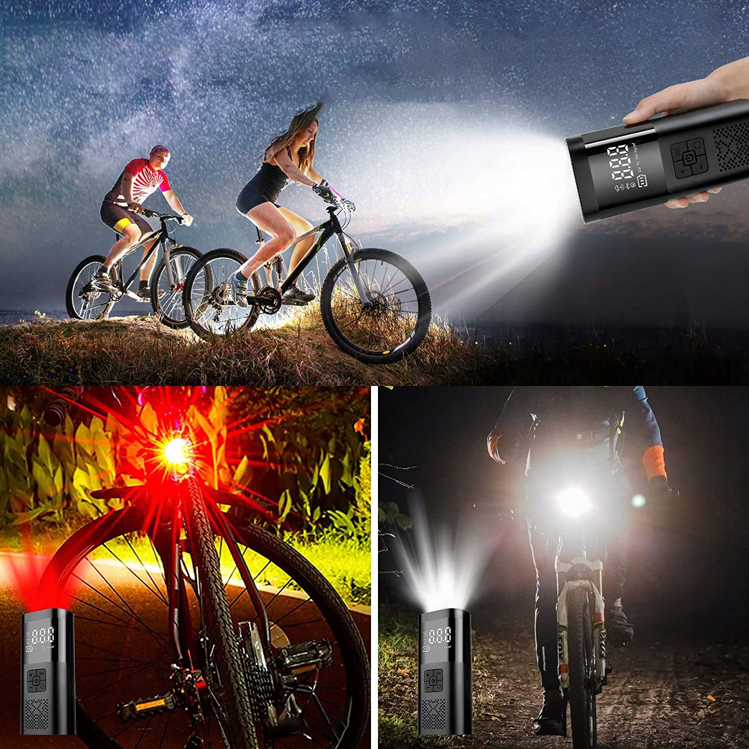 - Повітряний компресор із живленням від батареї має цифровий РК-манометр із 4 одиницями вимірювання тиску: PSI, KPA, BAR, KG/CM². Великий екран показує тиск у шинах у реальному часі та точно налаштований, тому ви можете легко вибрати правильний метод накачування. Цей велосипедний компресор має яскраві світлодіодні лампи з трьома режимами (освітлення, попередження, SOS).