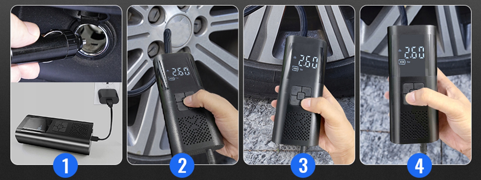 - у надзвичайній ситуації, коли накачується повітря в акумуляторі більше не має електрики, ми також пропонуємо кабель автомобільного адаптера 12 В постійного струму (3 м), який можна під’єднати до штекера автомобільного прикурювача як повітряний насос для накачування автомобільних шин.