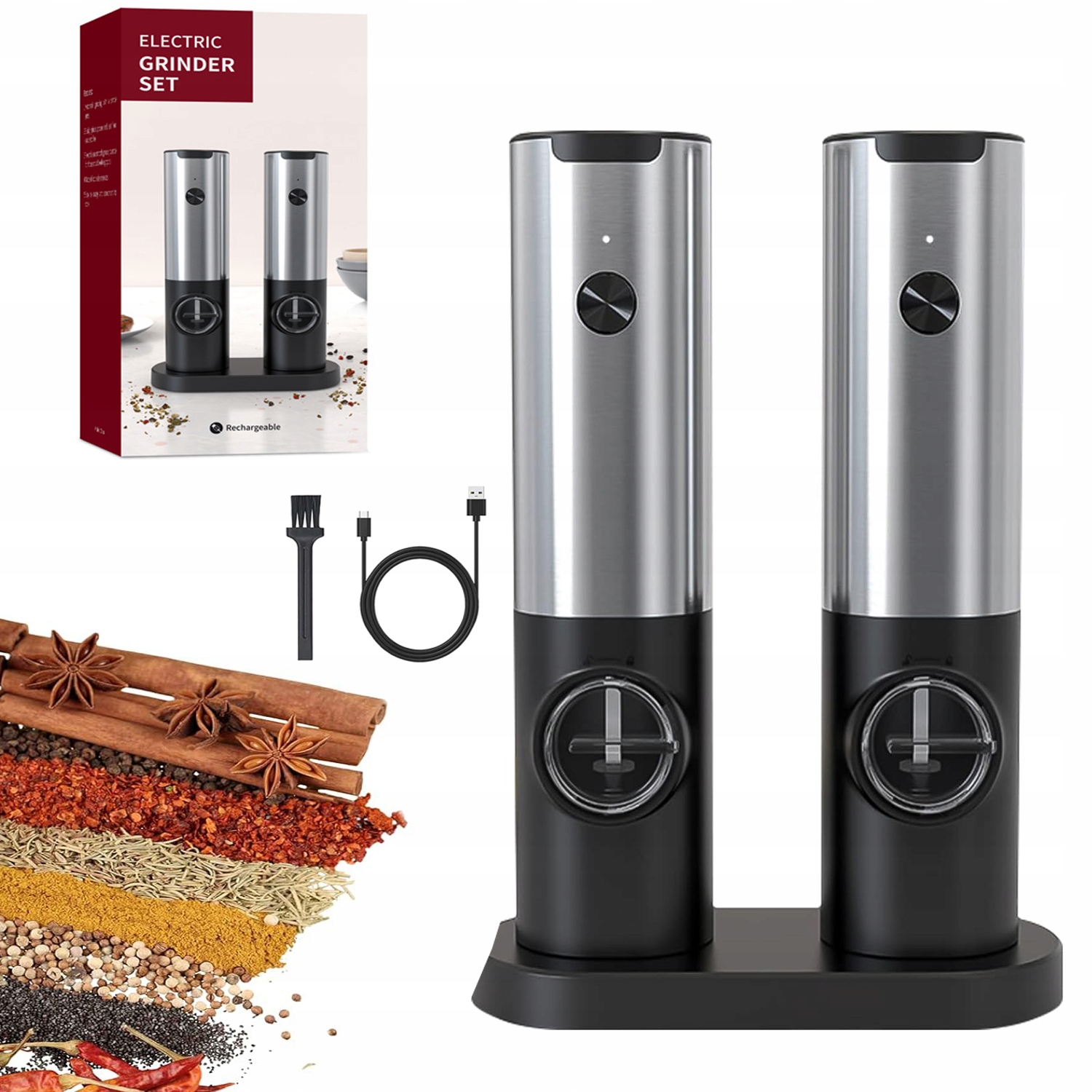 - ✔️Ви можете заряджати 2 млинки для перцю через USB-кабель типу C, для повної зарядки потрібно 2,5 години та через короткий час подрібніть 200-300 разів. Оснащений зарядною базою для зручного зберігання. Передній індикатор завжди горить під час заряджання, а повний індикатор вимкнено.