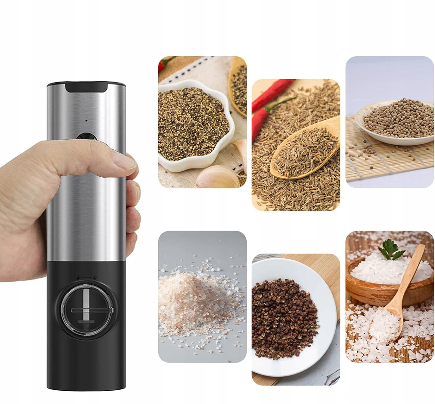 - ✔️Управління однією рукою: помістіть перець або сіль у ємність, натисніть і утримуйте кнопку, потім ви можете просто ефективно подрібнити, а іншою рукою ви можете перемішати страву з сіллю або перцем.