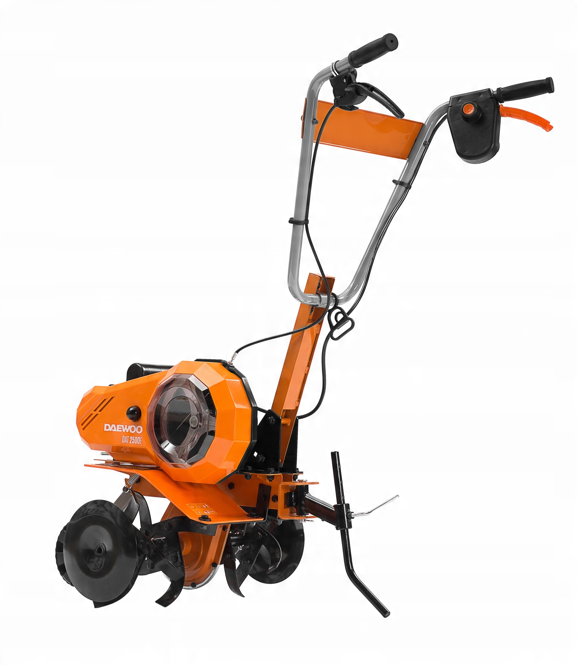 Фреза DAT 2500E оснащена електричним асинхронним двигуном і кованими ножами спеціальної вигнутої форми, завдяки чому вона справляється навіть із важким ґрунтом.