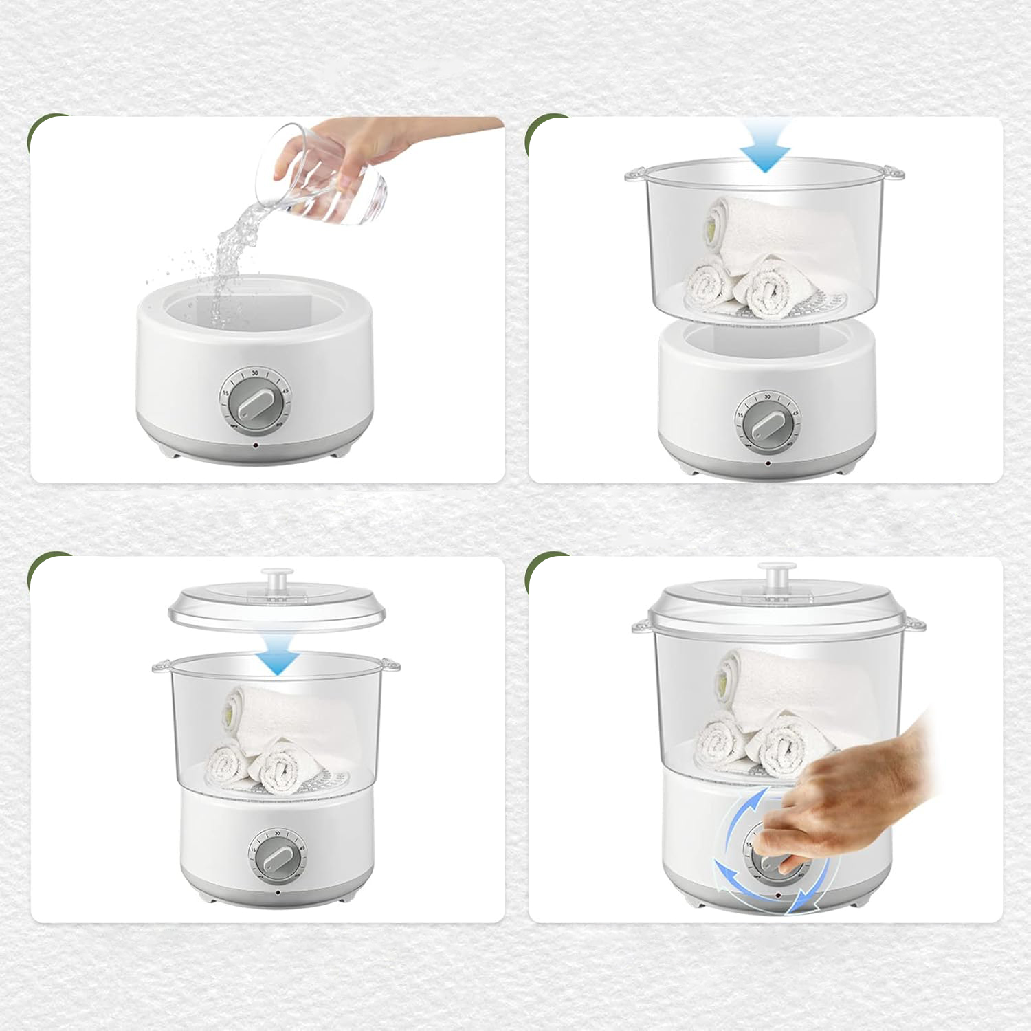 4 Більшість шкідливих бактерій можна усунути без використання хімічних речовин. Гарячі рушники полегшують очищення нашої шкіри, а рушники у парових ваннах є більш гігієнічними та здоровішими для нашої шкіри. Оснащений функцією таймера, щоб уникнути перегріву та розриву потужності. Ви можете встановити час приготування пари заздалегідь, щоб уникнути перегріву. Для додаткового захисту він автоматично вимикається, коли води немає. Він може нагрівати камені для масажу (стандартний час: 5 хвилин), пакетики з ароматерапії (5-8 хвилин) та гарячі рушники (вішалка для рушників підійде 4-6 невеликих рушників або 3-4 рушників середнього розміру). і розділену структуру. Пароплав відокремлений від основної структури, завдяки якій очищення зручніше і може бути використане безпечно. (Опалення викликає високі температури, теплі рушники слід утримувати подалі від дітей). Нагрівач рушників може не тільки нагрівати рушники, але й служити каменем для масажу для ароматних дифузорів. Підходить не тільки для домашнього використання, але й підходить для салонів краси та перукарських салонів.