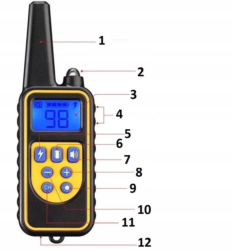 9. Кнопка підсвічування: вмикає та вимикає світлодіод. Якщо натиснути цю кнопку протягом 2 секунд, світлодіодний індикатор на приймачі стане білим, якщо натиснути її ще раз протягом 2 секунд, світлодіодний індикатор вимкнеться. Якщо кнопку не натиснути знову, білий світлодіод автоматично вимкнеться через 10 секунд.