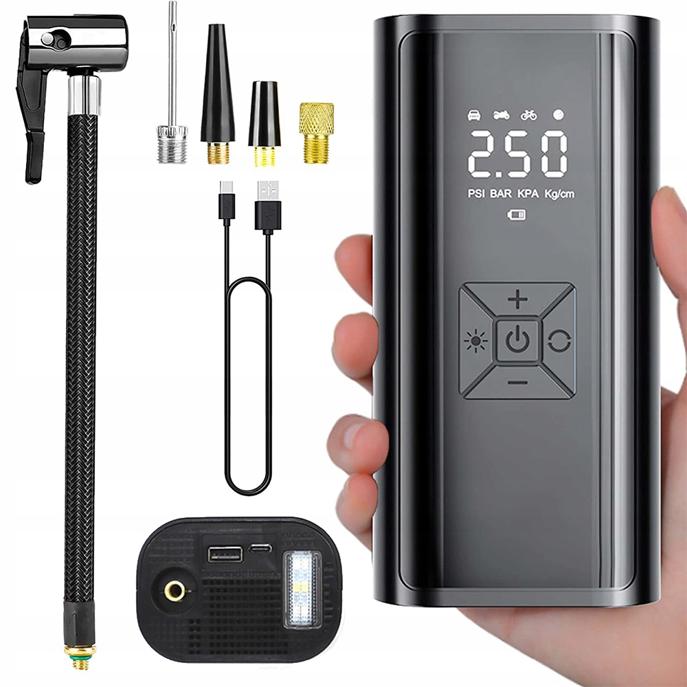 - Вироблений батарею повітряний компресор оснащений цифровим манометром тиску з 4 одиницями вимірювання тиску - PSI, KPA, BAR, KG/CM².