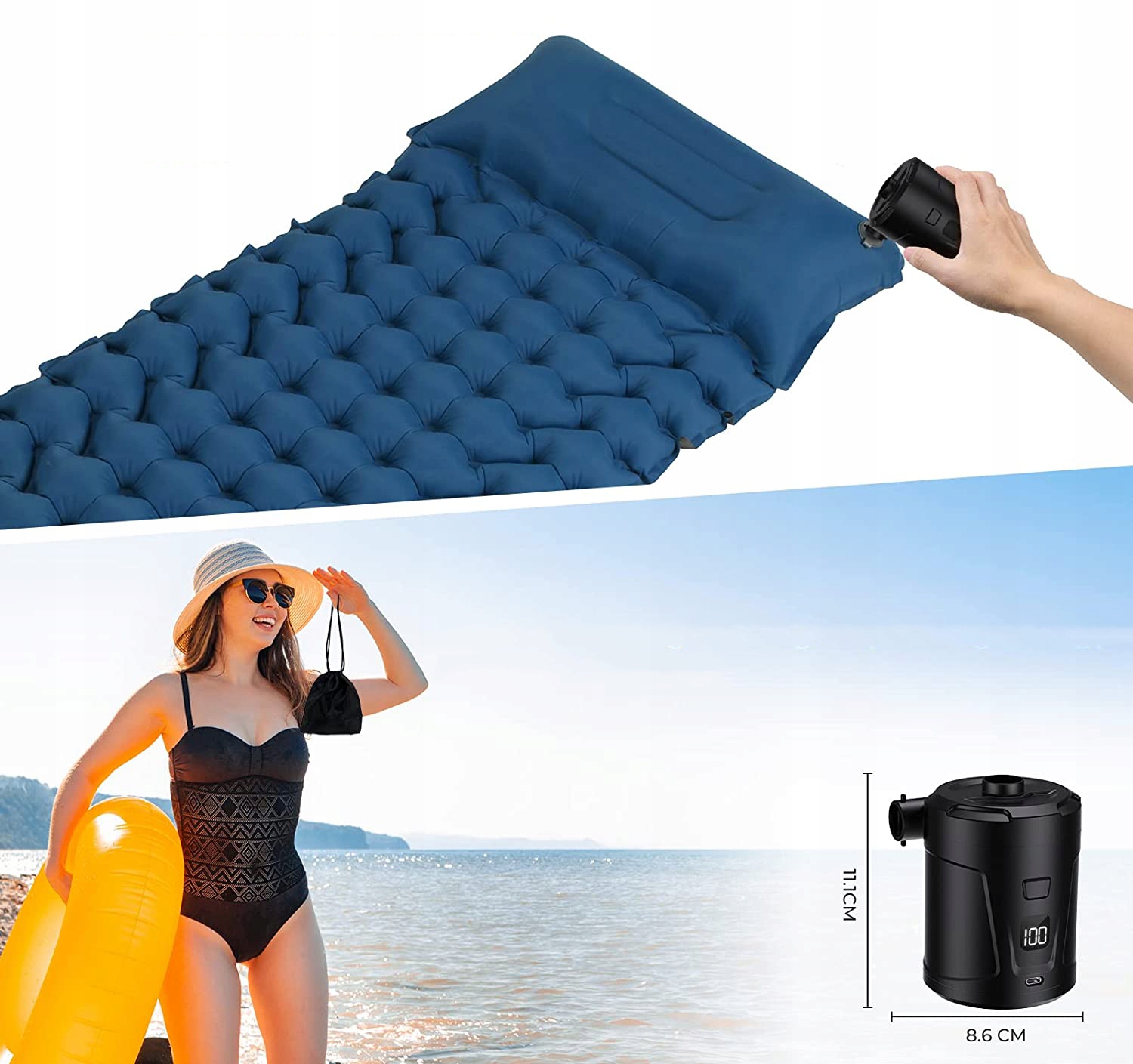 оснащена ефективним безщірним двигуном, забезпечує стабільний потік повітря під високим тиском і дозволяє матраца надути за короткий час. Особливо він підходить для транспортування предметів високої ємності, таких як надувні матраци та рятувальник, що дозволяє вам врятувати час очікування.