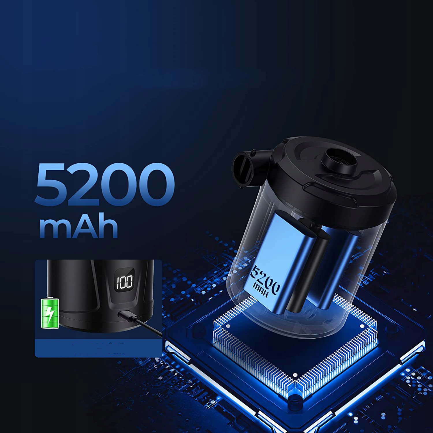 Завдяки побудованому батареї великою ємністю 5200 мАг, однієї зарядки достатньо для задоволення багатьох потреб насосів, наприклад. Швидке наповнення багатьох спортивних обладнання (наприклад, баскетбольних та футбольних кульок) або невеликих подушок безпеки, усуваючи проблему частих сполучних зарядних пристроїв. Підходить для використання зовні або в місцях, де немає джерела живлення.