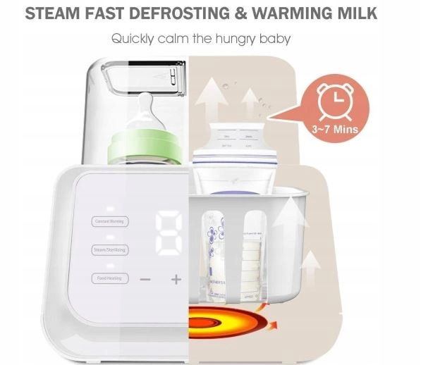 - Функція швидкого розморожування та нагрівання:30 мл води виробляє достатньо пари, щоб розморозити або нагріти молоко протягом 3-7 хвилин, що швидко заспокоює дитину, що плаче. Дизайн «Світлячок» для пляшечок різної форми.