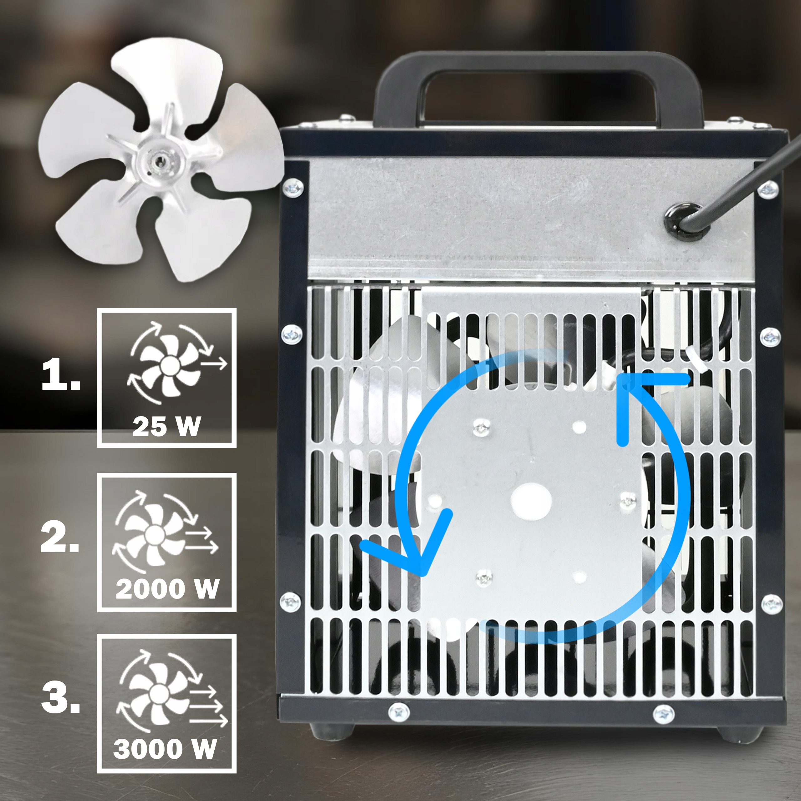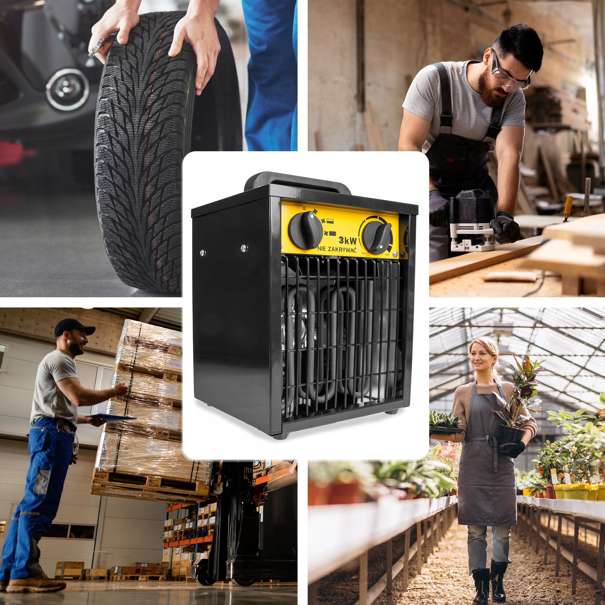 Потужність 3000 Вт дозволяє підняти температуру в приміщенні за кілька секунд. Ідеально підходить для гаражів, майстерень, складів або будинків, коли вам потрібен миттєвий тепловий комфорт.