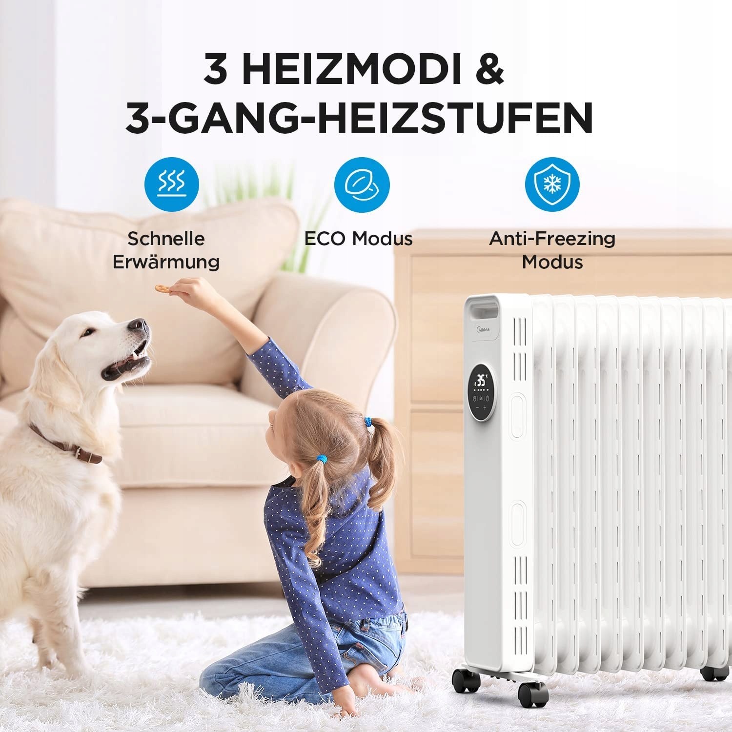11 масляних нагрівальних ребер потужністю до 2300 Вт і індивідуальним регулюванням температури від 5 до 35 градусів: цей масляний радіатор вміє нагрівати швидко і ефективно. Ним можна керувати за допомогою вбудованого світлодіодного дисплея та дистанційного керування, і його можна налаштувати за 24 години. Це гарантує, що пристрій можна ввімкнути та вимкнути в потрібний час, навіть коли ви відсутні або спите. Залежно від того, наскільки холодно, ви можете вибрати один з трьох рівнів потужності. Вбудований захист від замерзання та перегріву також дозволяє активне чи пасивне використання протягом тривалого часу.