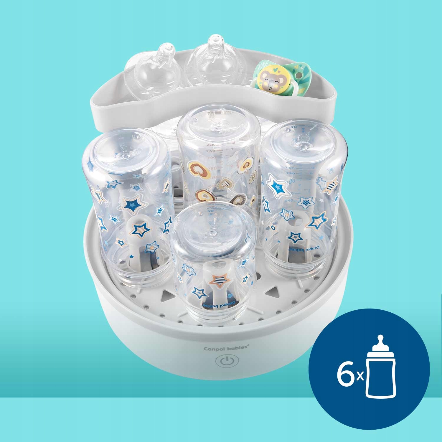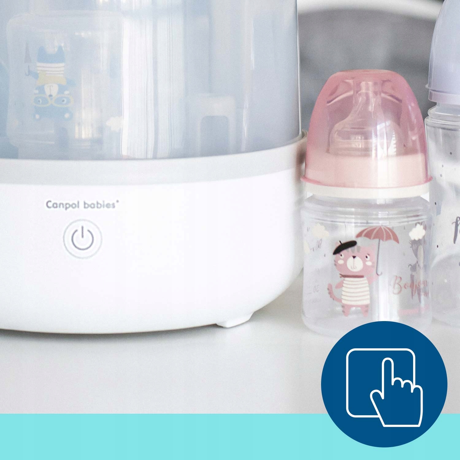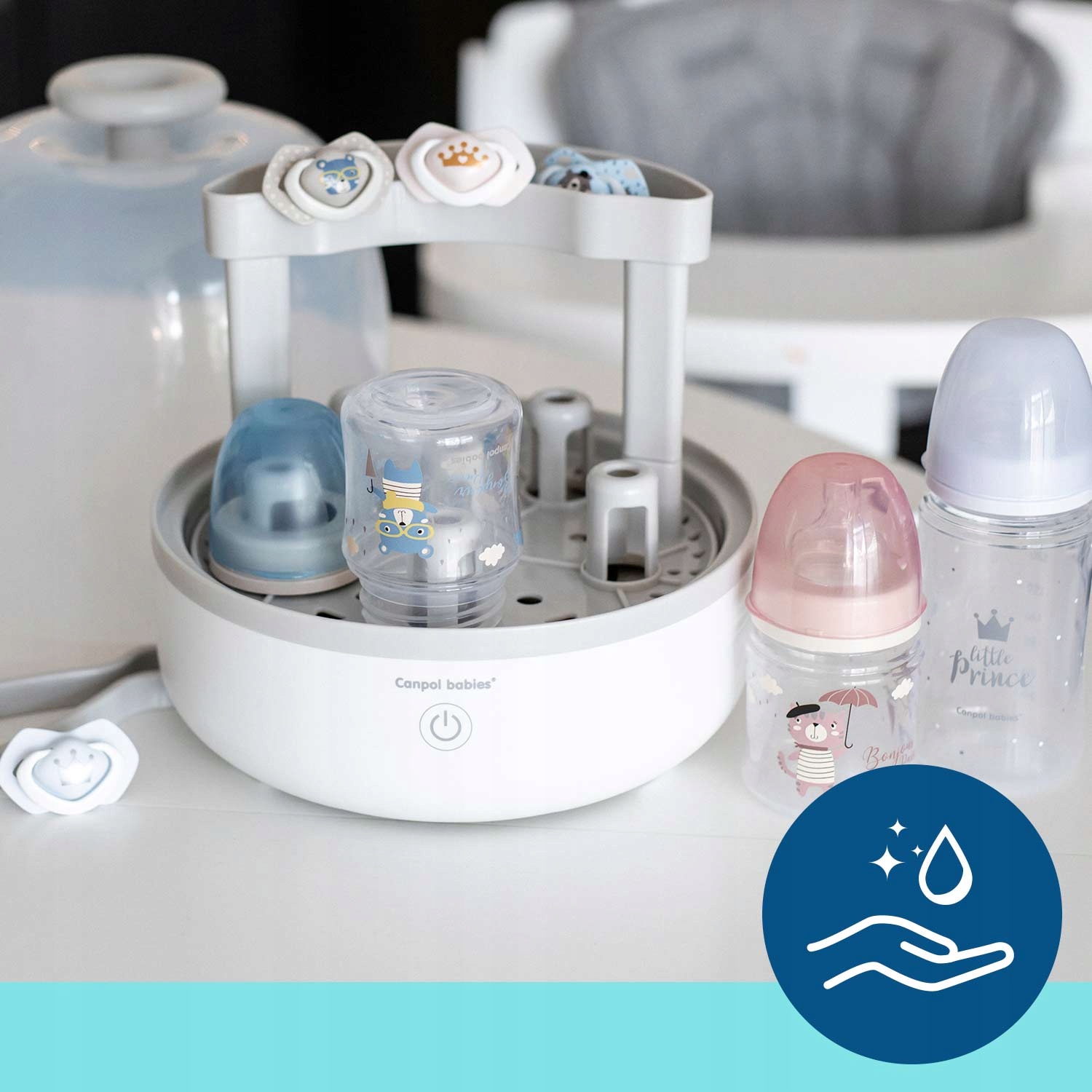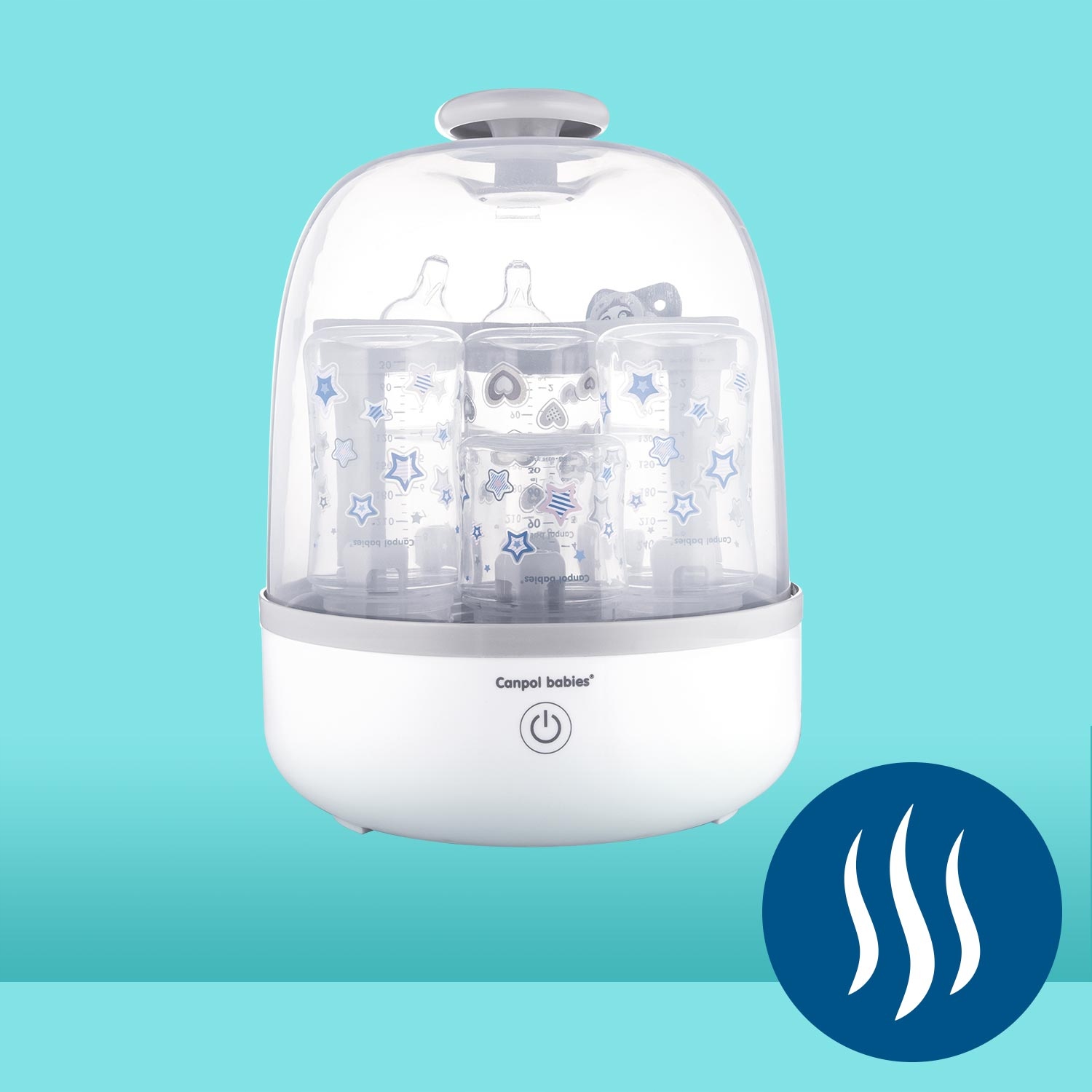Електричний паровий стерилізатор дозволяє швидко та зручно дезінфікувати приладдя для годування та догляду за немовлям. Одночасно він може вмістити 5-6 пляшок та інші дрібні аксесуари.
