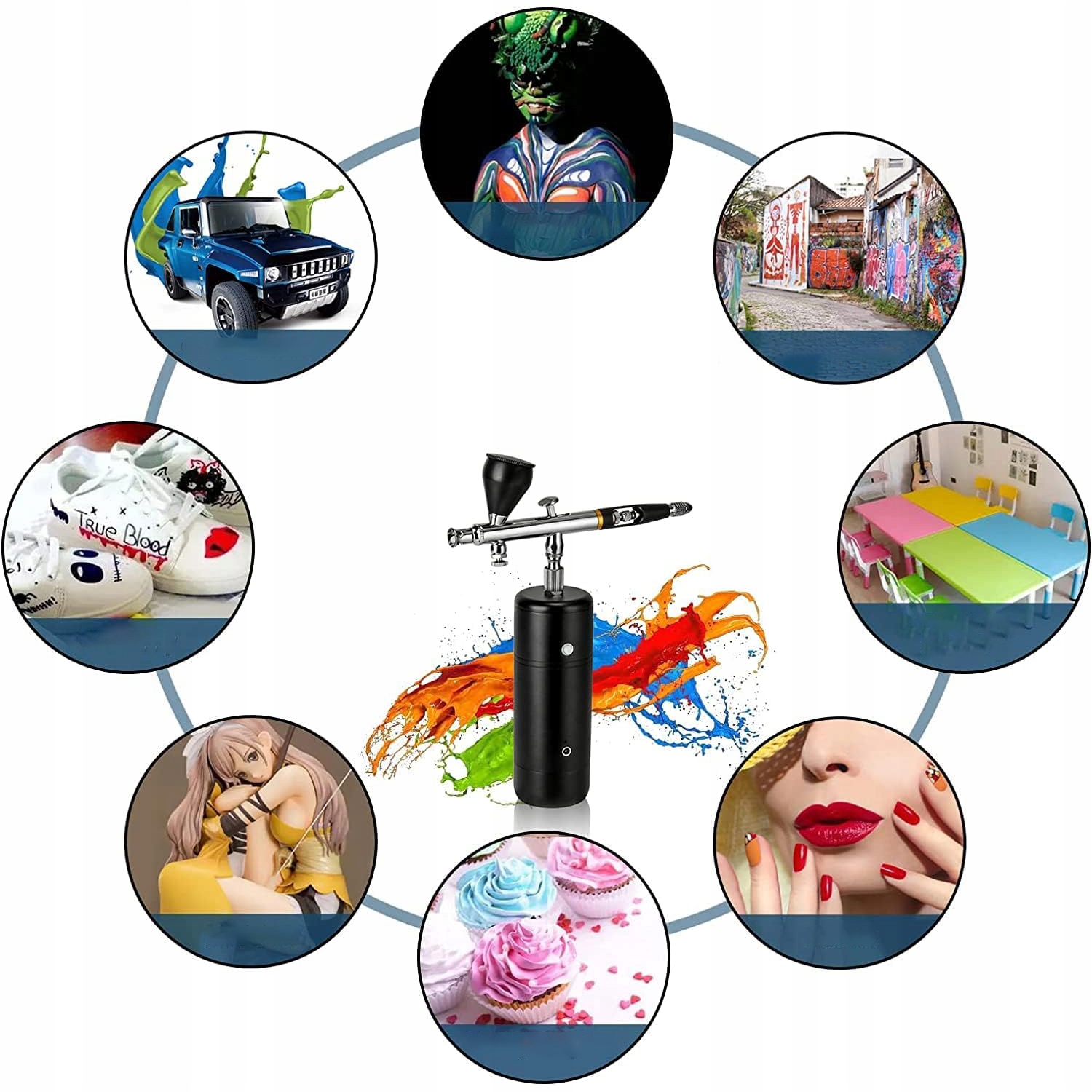 - Бездротовий аерограф пропонує три параметри тиску повітря (18 фунтів на квадратний дюйм, 25 фунтів на квадратний дюйм і 30 фунтів на квадратний дюйм), що робить його придатним для різноманітних застосувань, таких як малювання нігтів, обличчя зволоження та макіяж, декорування тортів і печива, перукарські роботи, малювання моделей, рукоділля тощо.