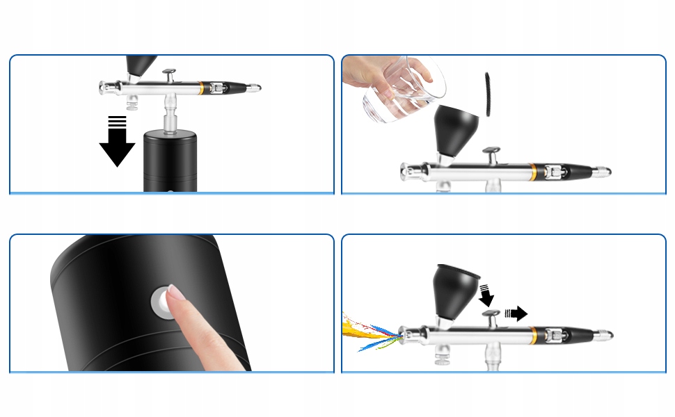 - Цей набір аерографа подвійної дії не лише контролює потік повітря на кінці аерографа, але й об’єм фарби за допомогою диска на аерографі. Тригер подвійної дії забезпечує неймовірний контроль і дозволяє створювати тонкі та широкі лінії.