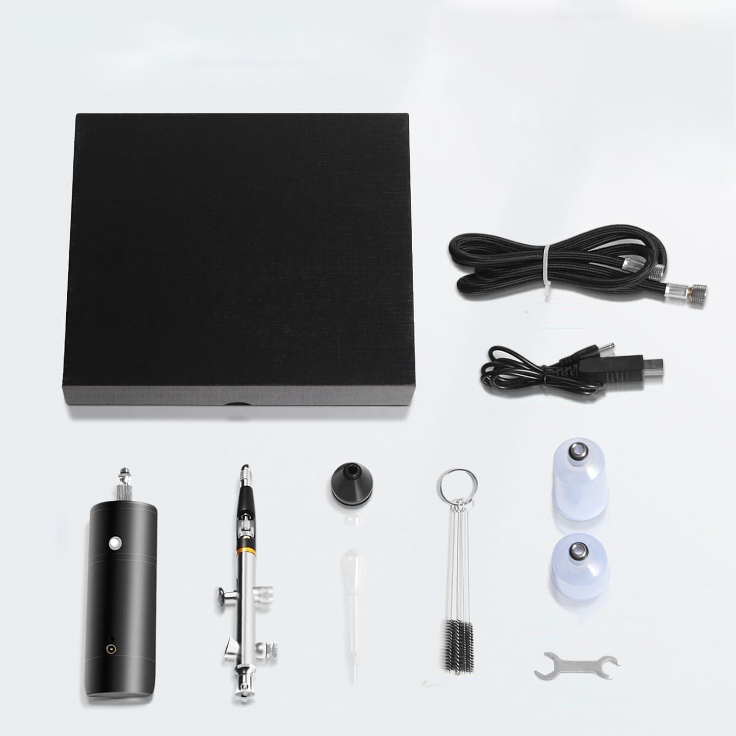 - Набір включає розпилювальний пістолет та косовий шланг, який можна з'єднати безпосередньо з пістолетом для розпилення повітря або рідини, або підключений через косовий шланг для розпилення повітря або рідина Різні засоби для чищення щітки дозволяють ретельно чистити внутрішній аерограф.