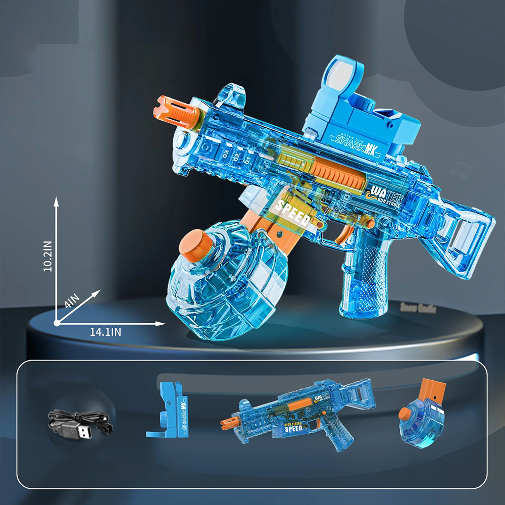 Електрична водна пістолет приймає конструкцію складу високої потужності і може вмістити велику кількість води. Вхід води для нового журналу був розроблений посеред журналу, тому вам не потрібно турбуватися про витік складу. Водний пістолет також був розроблений з автоматичною функцією поглинання води, що значно зменшує неприємності при доповненні штучної води, економить час та забезпечує кращий досвід стрілянини та боротьби за дорослих та дітей.