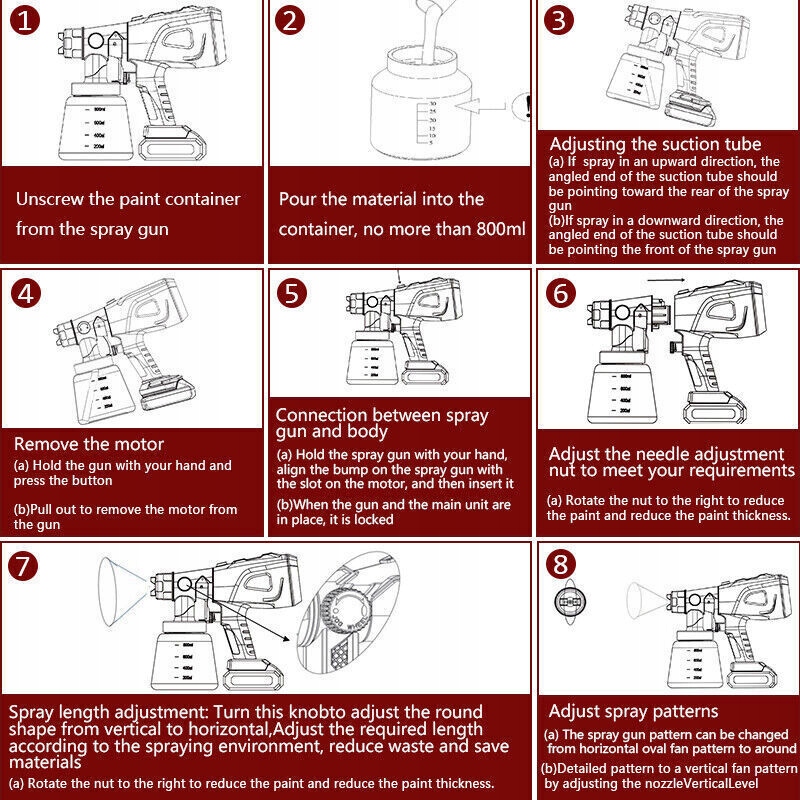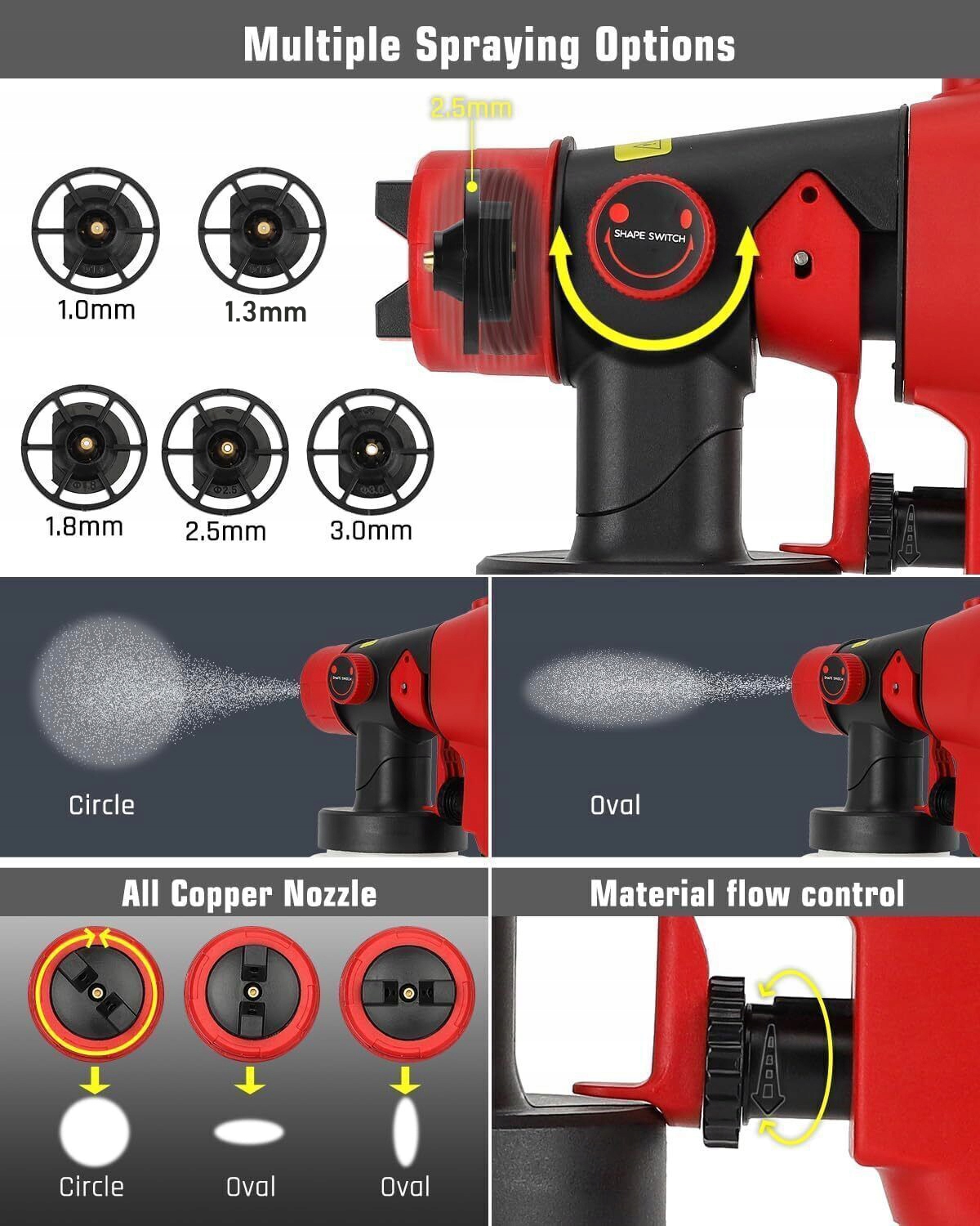 Електричний фарбувальний пістолет: з 5 соплами (1,0; 1,3; 1,8; 2,5 і 3,0 мм), які забезпечують густе або тонке розбризкування. 3 Схема розпилення (горизонтальна, вертикальна та кругова).