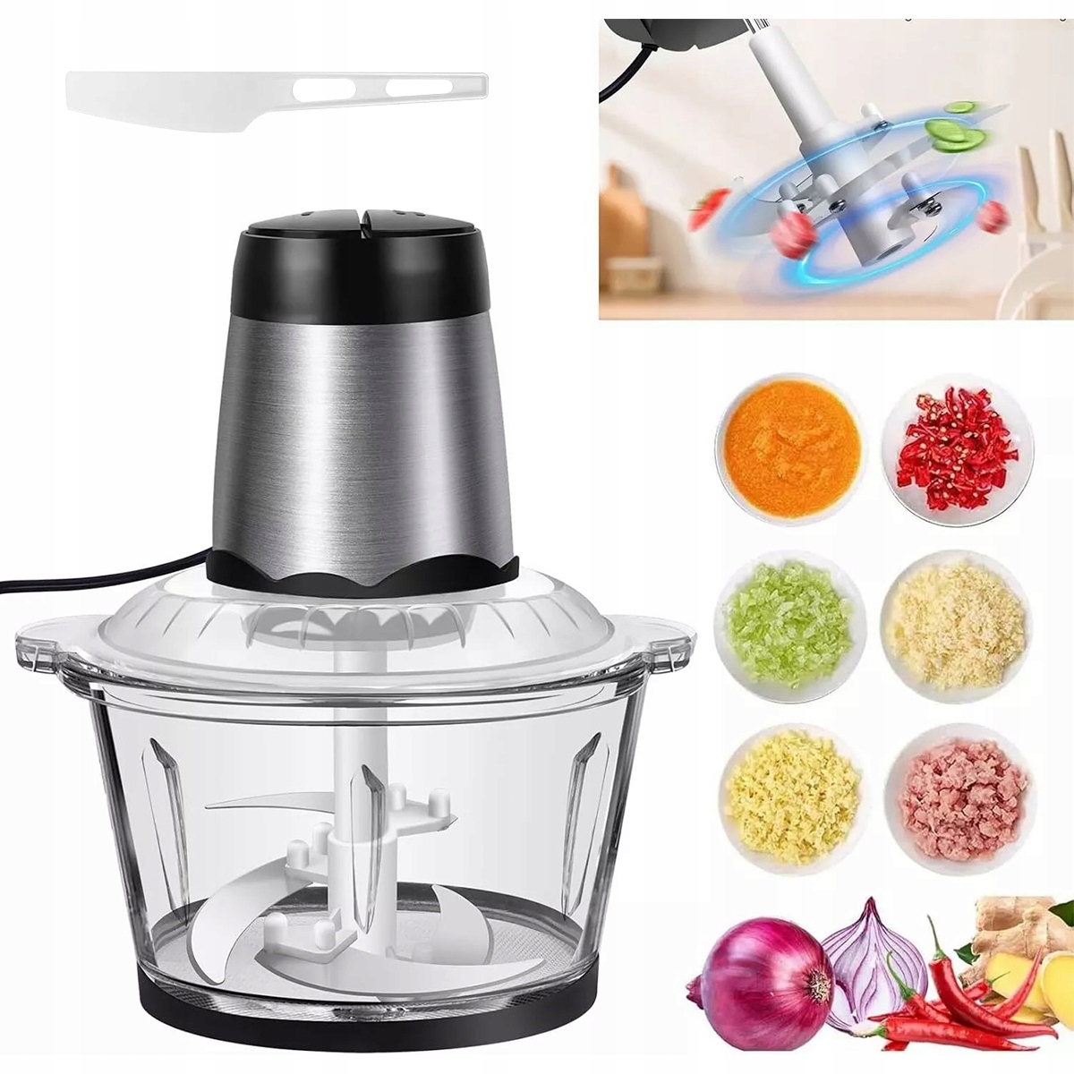 Електричний подрібнювач Дуже сильний багатофункціональний миттєвий різцевий 300 Вт 2l Електричний універсальний різцевий із скляною ємністю Універсальний кухонний змішувач для дітей для дітей горіхи горіхи овочеві фрукти (срібляста чорна) 1>