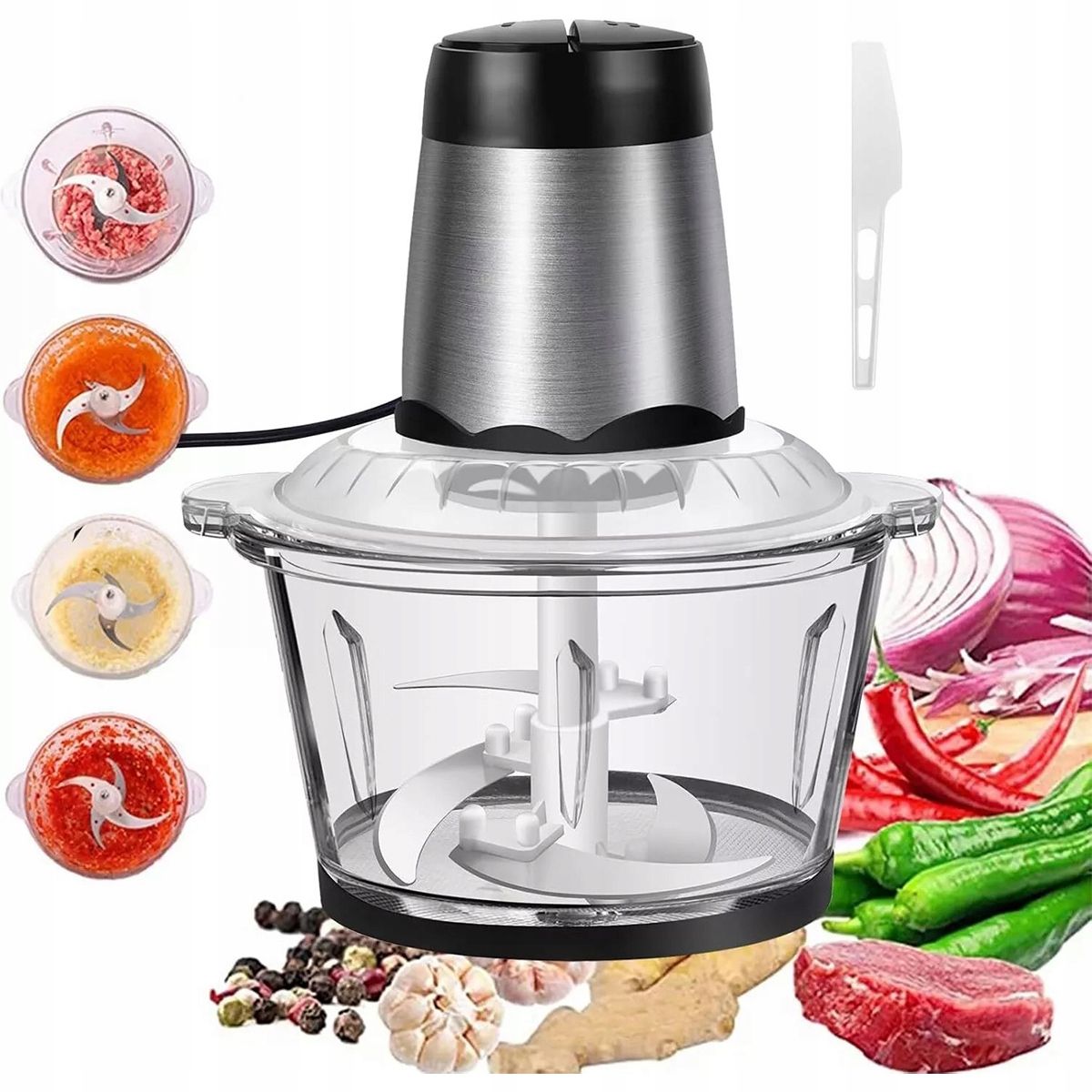 Домашній -2 -літерний подрібнювач оснащений високоякісними 4D -лезами з нержавіючої сталі, які забезпечують ефективне та точне рубання, різання кубиків та шліфування різних інгредієнтів. Ці міцні леза призначені для різних завдань, від рубання овочів і фруктів до горіхів, трав та багатьох інших. Ідеально підходить для м'яса, фруктів, овочів, горіхів, насіння тощо.
