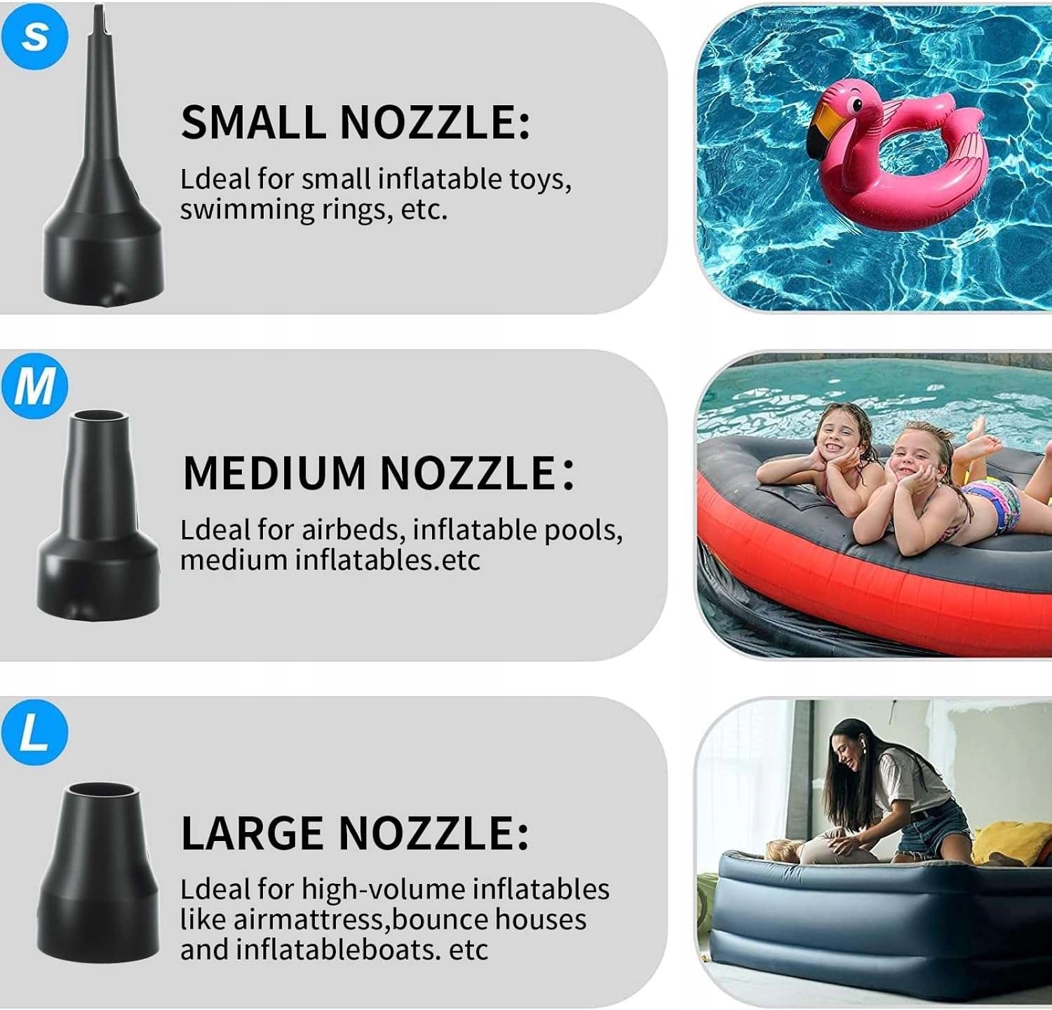 ✅ Кілька насадок: у набір входять три насадки різних розмірів, які підходять для різних отворів для надування та скачування. Завдяки їм насос можна використовувати для накачування та здування різних предметів, таких як надувні човни, кільця для плавання, спортивне туристичне спорядження, басейни та дитячі іграшки.