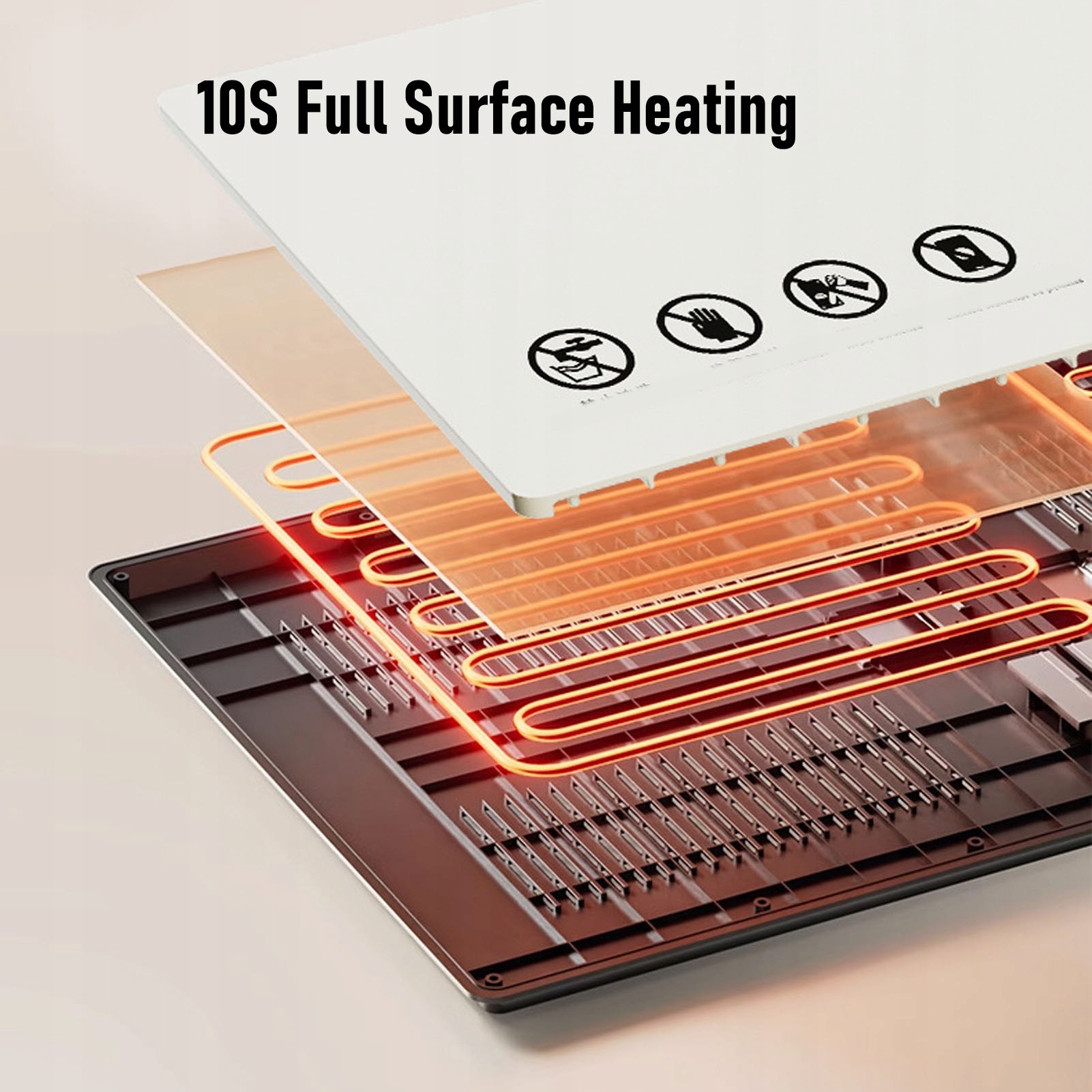 1. 10-секундне нагрівання повної площі: Швидке та рівномірне нагрівання великої площі обігріву. Наш розумний нагрівальний дріт забезпечує швидкий і рівномірний розподіл. Навколо піддона для підігріву, не заповненого нагрівальними елементами, зберігається ширина 1 см, щоб уникнути випадкових опіків.