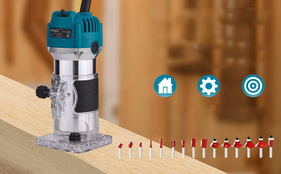 ✔️ Широке застосування: цей електричний тример широко використовується в деревообробці, обробці столів, ручній роботі виробництво, пластикові плівки, дерев'яний шпон та інші подібні матеріали, зняття фаски, канавки, обробка поверхонь, різання кривих, планування кромок деревини, операції обробки візерунків та DIY. Легке різання деревини, довбання канавок.