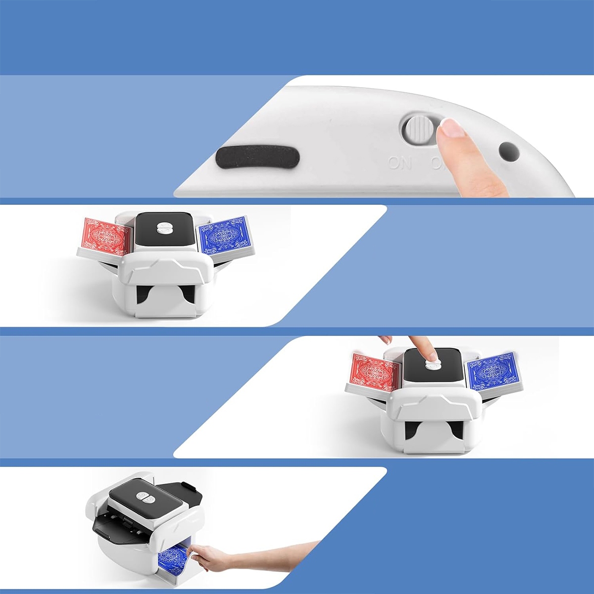 ✅Розумне та просте тасування: пристрій для тасування карток пропонує два зручні варіанти тасування: автоматичне тасування натисканням кнопки та ручне тасування, адаптоване до індивідуальних уподобань гравця. Розумні датчики автоматично виявляють картки та зупиняють процес тасування, не натискаючи кнопку.
