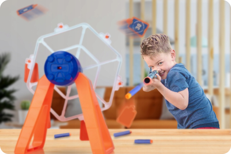 Це обертовий електричний диск із підвішеними мішенями у формі "колеса огляду". Ідеальна розвага для дітей і дорослих будь-якого віку. Візьміть свій іграшковий пістолет і перевірте свої навички в цій аркадній грі!
