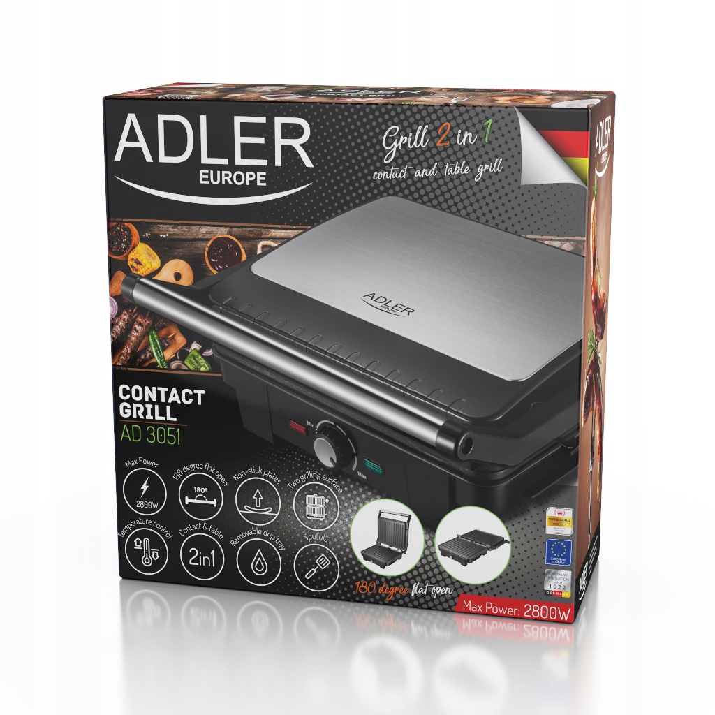 Електрогриль Adler 3051 з максимальною потужністю 2200 Вт дозволяє готувати широкий спектр гарячих страв - від підсмажених гамбургерів, через стейки, свинячу шийку, курку та інше м'ясо, до овочів і сирів на грилі. Нагрівальні плити захищені тефлоновим покриттям, завдяки чому їжа не прилипає, а подальше миття займає лише мить. Крім того, покриття дозволяє готувати на грилі без додавання жиру, а дренажний отвір робить страви здоровішими.
