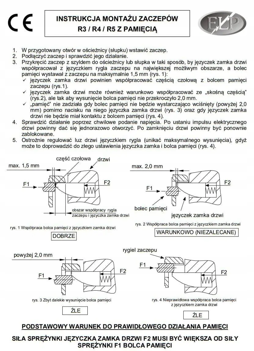 З пам'яттю - функція пам'яті дозволяє відкрити двері без використання ключа. Подаючи електричний імпульс за допомогою кнопки в телефоні, засув «запам’ятовує» його, тобто відмикає засув до моменту відкриття дверей. Закриваючи двері, ми «стираємо» пам'ять, потім засув повертається в початковий стан. Ми можемо використовувати цю функцію, коли: - ми хочемо вийти з кімнати без ключа або дверної ручки, - коли нам потрібно пройти через кілька дверей, ми можемо відімкнути їх усі одним коротким імпульсом, - процес вступу вимагає часу. Докладні інструкції щодо встановлення фіксатора пам’яті можна знайти в розділі «Документація».
