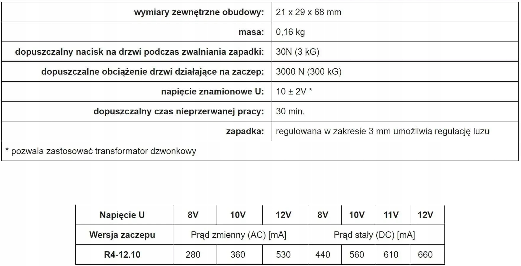 Симетрична конструкція та невеликі розміри дозволяють використовувати його в системі відкатних воріт. Запірка R4 може працювати з домофонними установками у всіх типах вхідних дверей. Він виготовлений із корозійностійких матеріалів, тому його можна встановлювати поза будівлями, але його потрібно захистити від затоплення, погодних умов та фарбування.