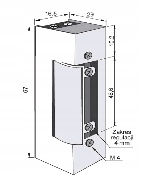 - Він має діапазон регулювання язика 4 мм, що дозволяє усунути будь-який люфт між язичком електричного замка та язичком замка воріт.< /li>