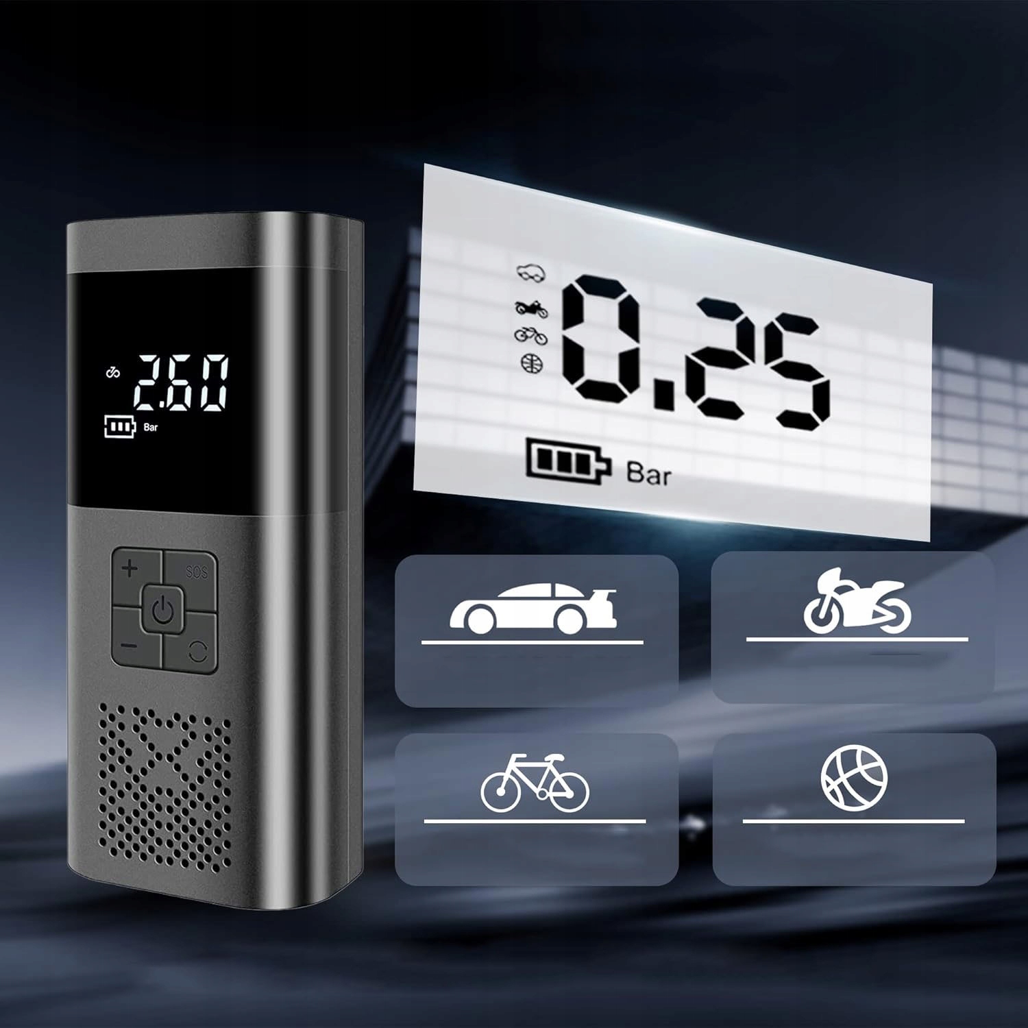 ✔ Цифровий манометр РК з 4 одиниць вимірювання тиску - psi, kpa, bar, kg/cm² . На великому екрані точно відображається поточний та запрограмований тиск у шинах, полегшуючи вибір правильного методу насосів.