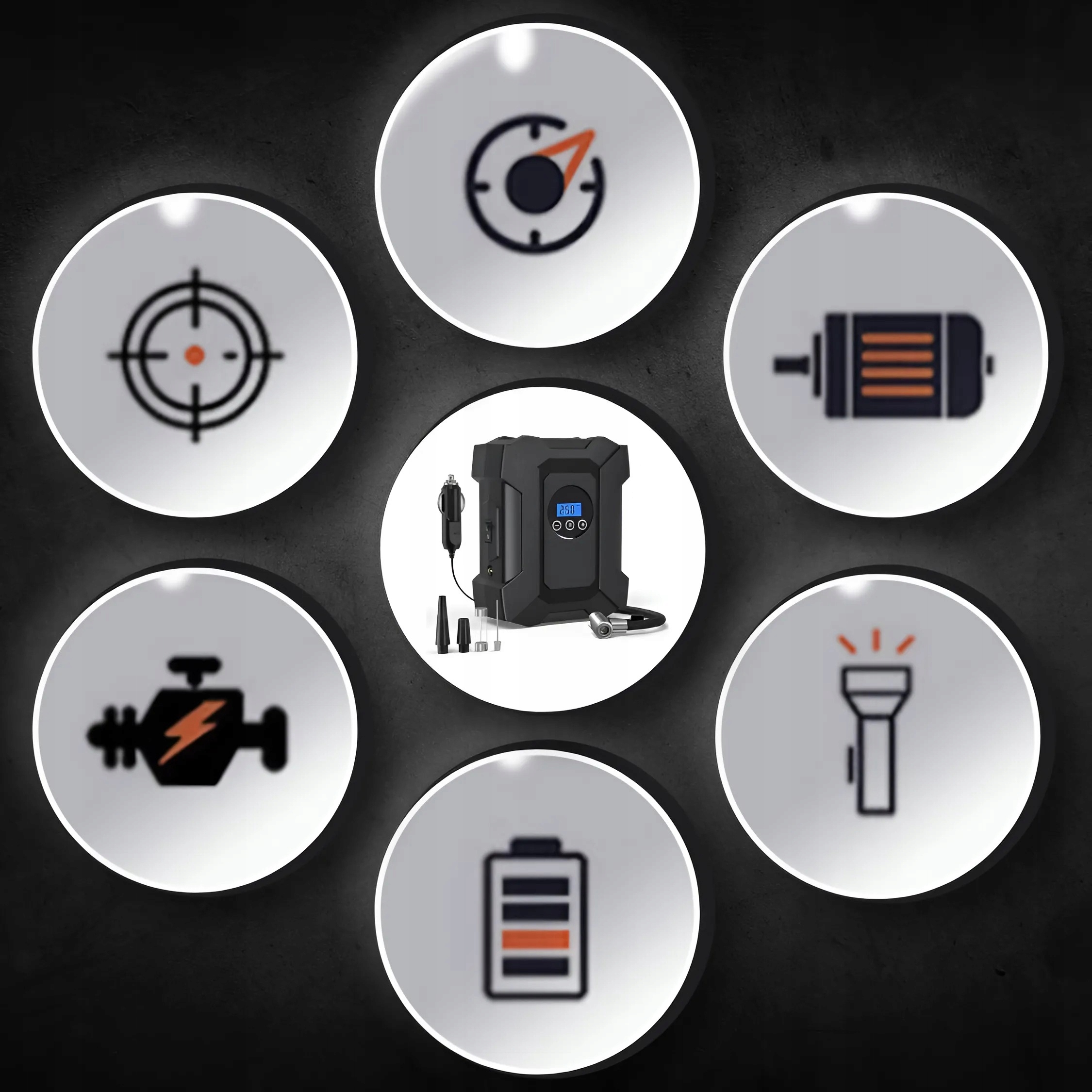 Портативний компресор має міцний корпус, велику ємність акумулятора і оснащений ліхтариком, завдяки якому він ідеально працює в різних, несподіваних ситуаціях.
